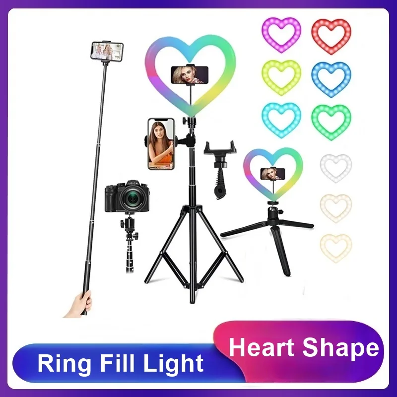 Anillo de luz para foto regulable RGB con forma de corazón de 26cm, lámpara Led para selfies, iluminación para fotografía de teléfono con soporte de trípode para vídeo de Youtube, maquillaje en vivo