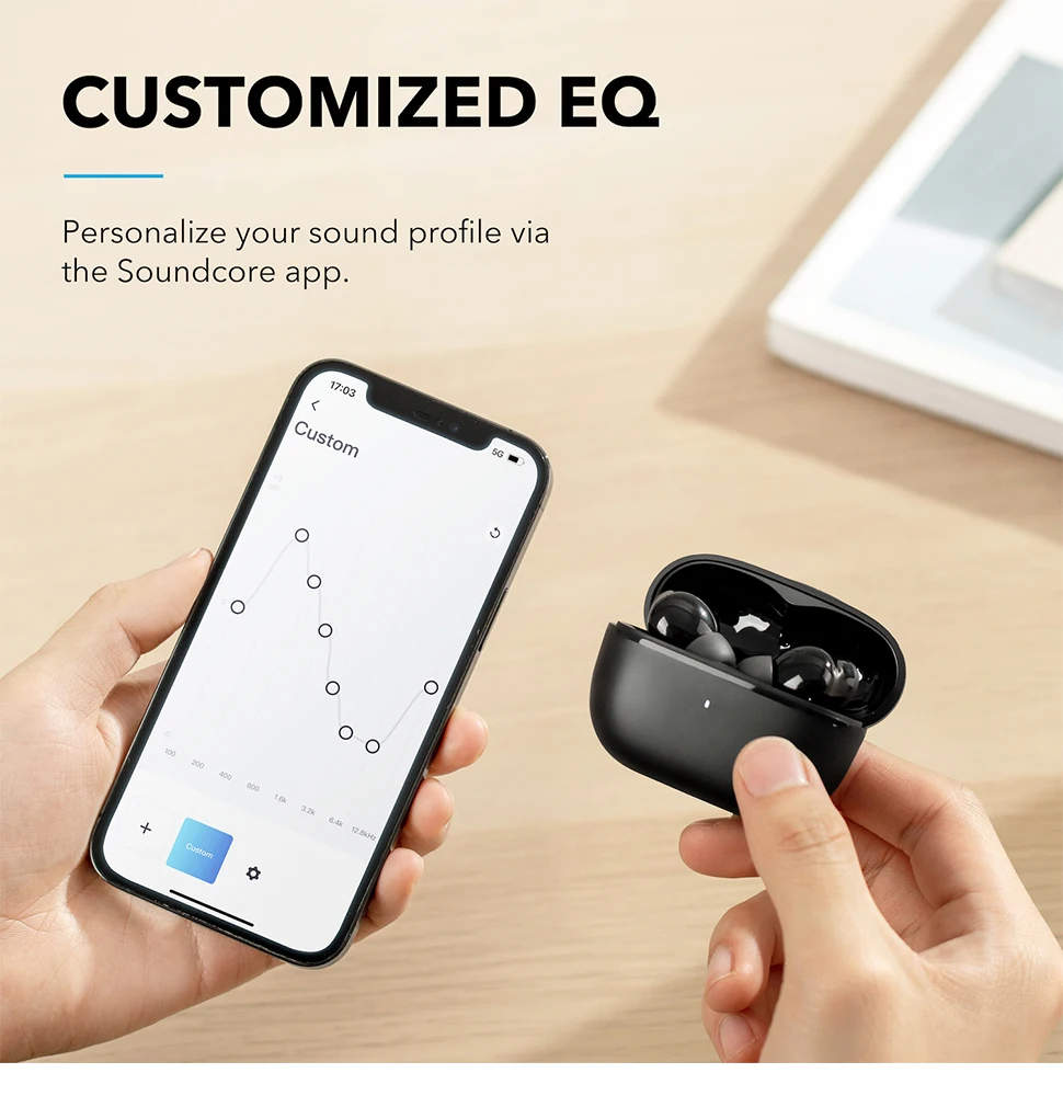 Utilice la aplicación Soundcore para elegir entre 22 configuraciones de ecualizador, personalizar su perfil de sonido o cambiar entre sus modos de sonido preferidos.