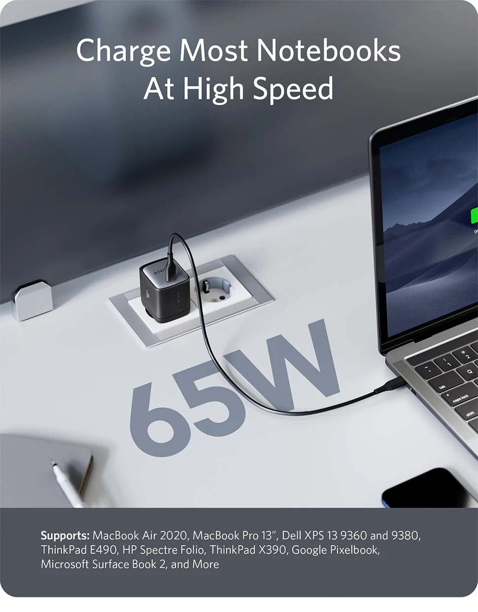 La Salida de 65W y 2 W proporciona suficiente energía para cargar portátiles emblemáticos, incluido el MacBook Air 2020,