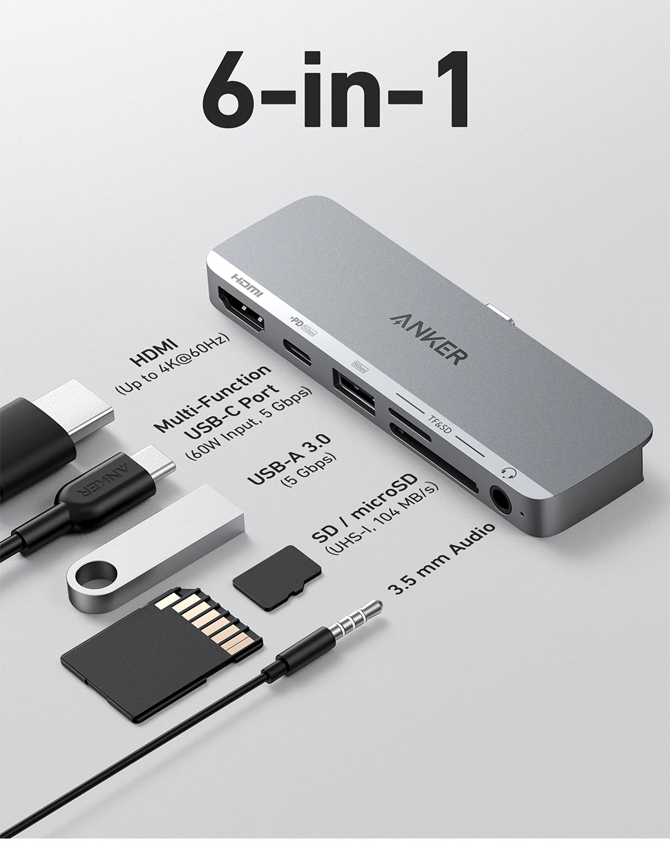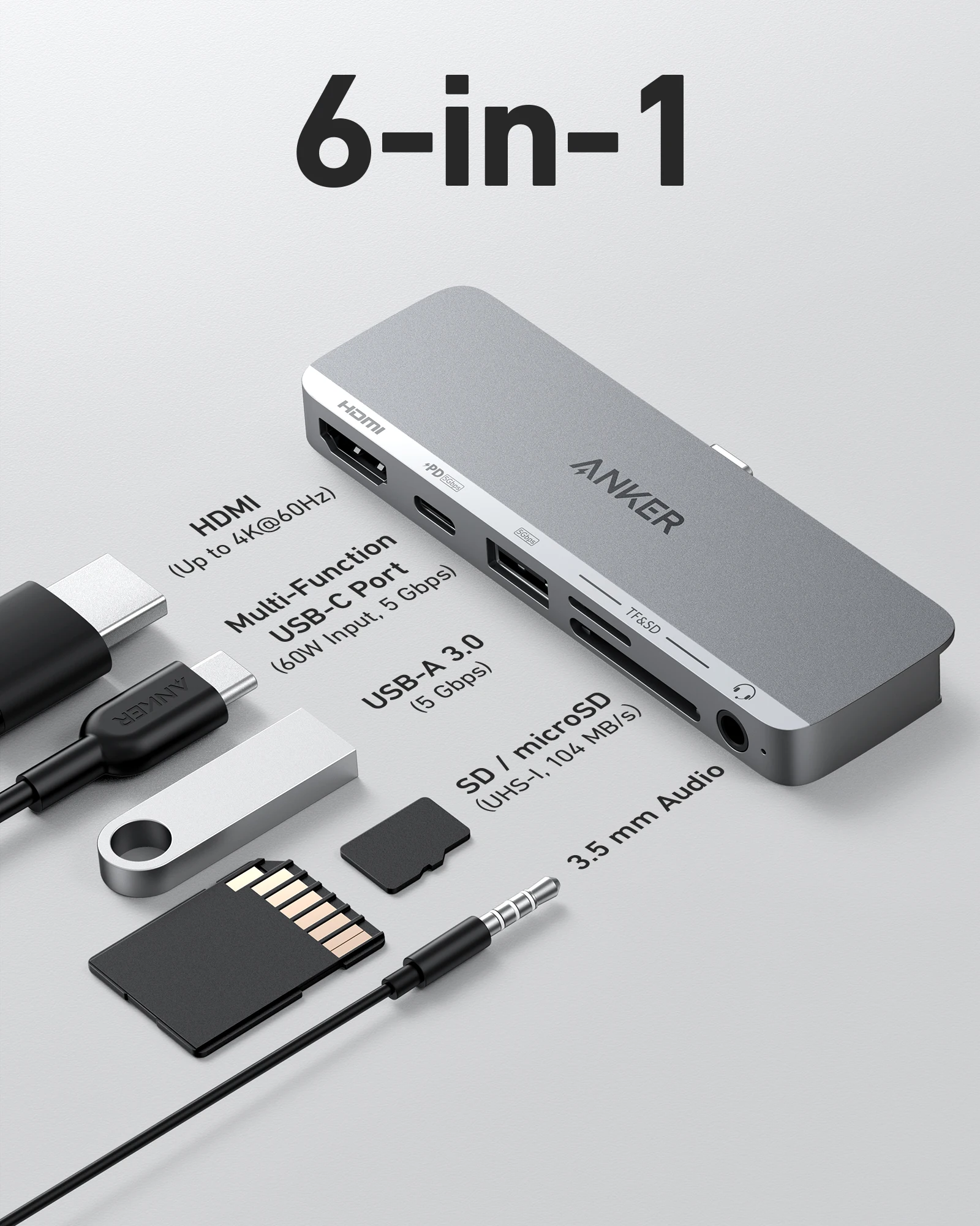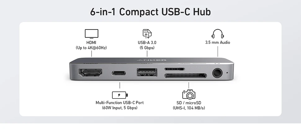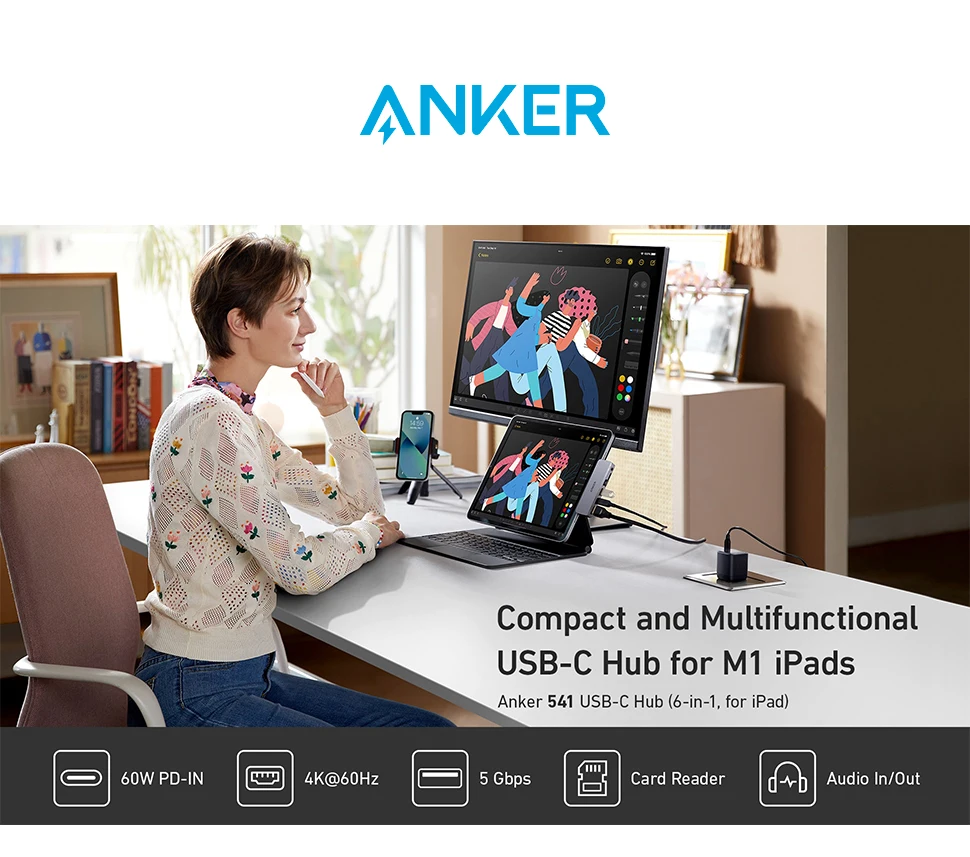 Comprar Anker-concentrador de red USB C para iPad, Hub de 541 USB-C (6 en 1) con puerto HDMI 4K, puerto de USB-C multifunción, ranuras para tarjetas SD y microSD, para USB-C