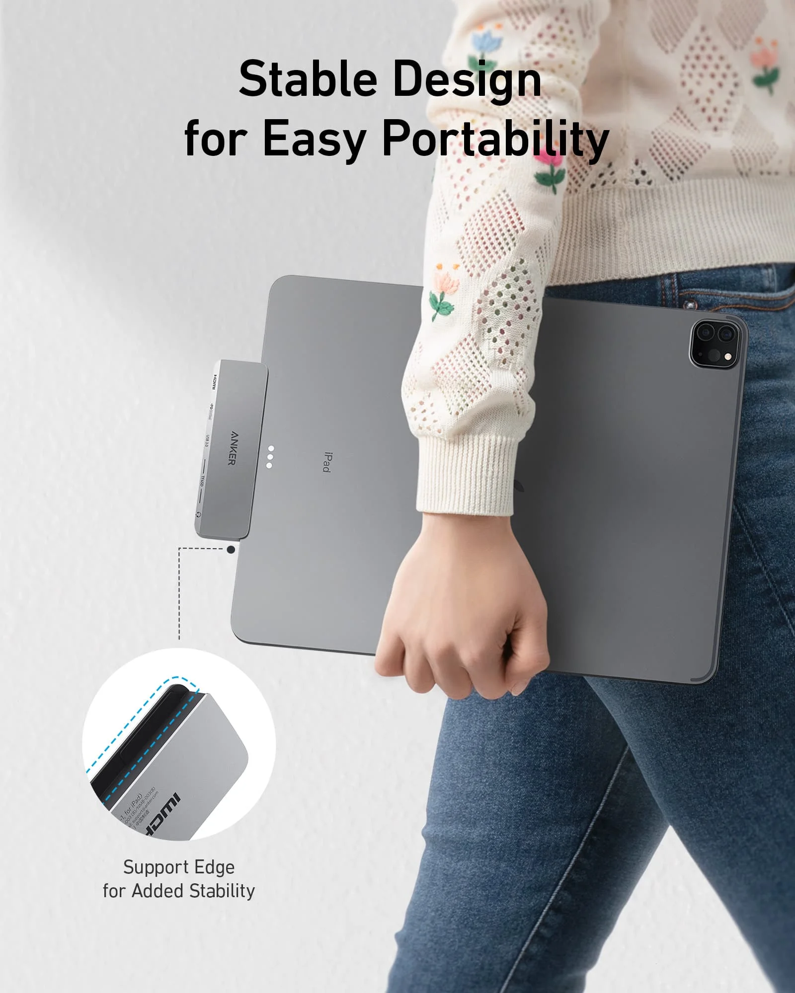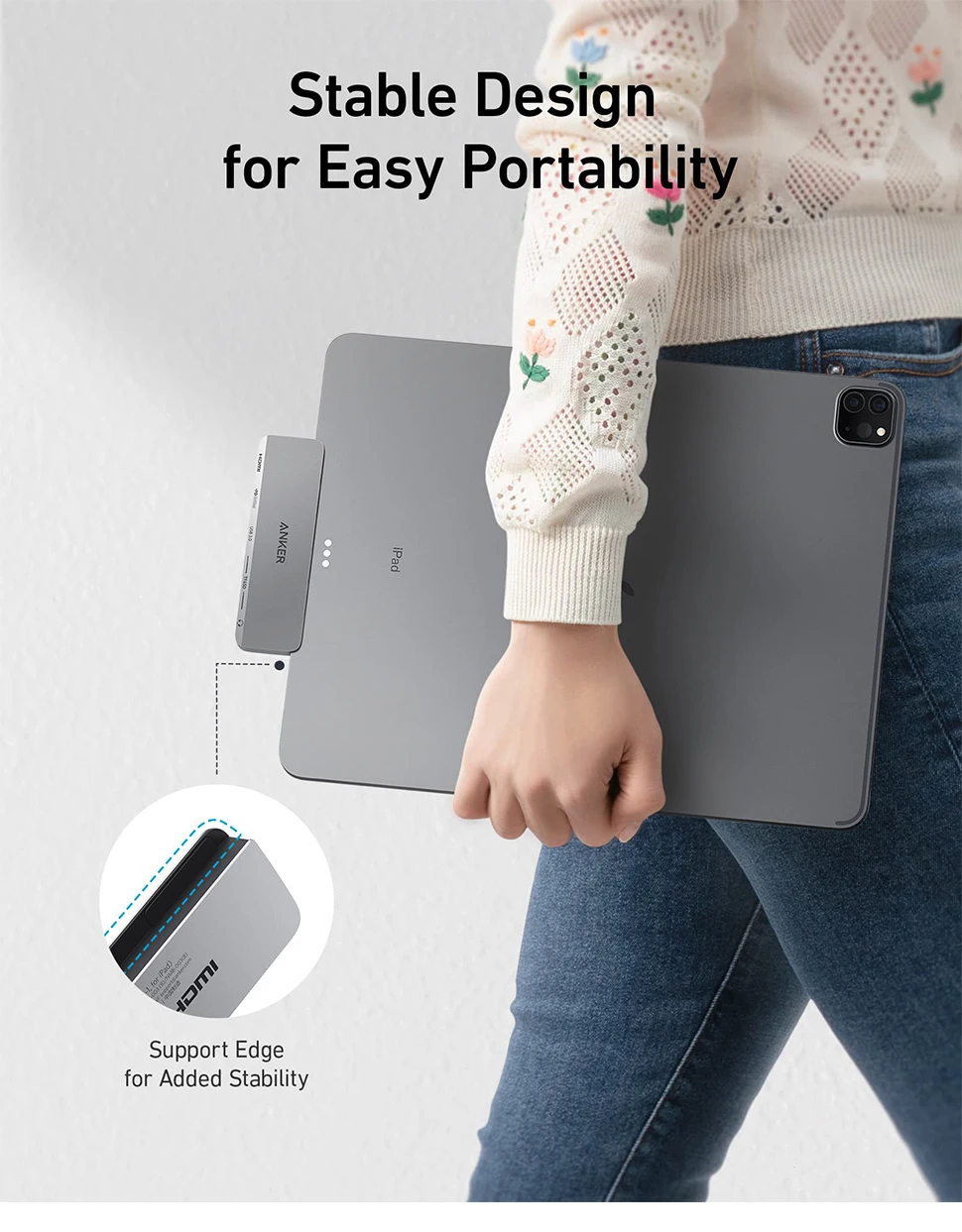Un lado del hub está diseñado un poco más largo para adaptarse firmemente al lado de tu iPad. Esto ayuda a garantizar la estabilidad mientras trabaja o cuando está en movimiento.