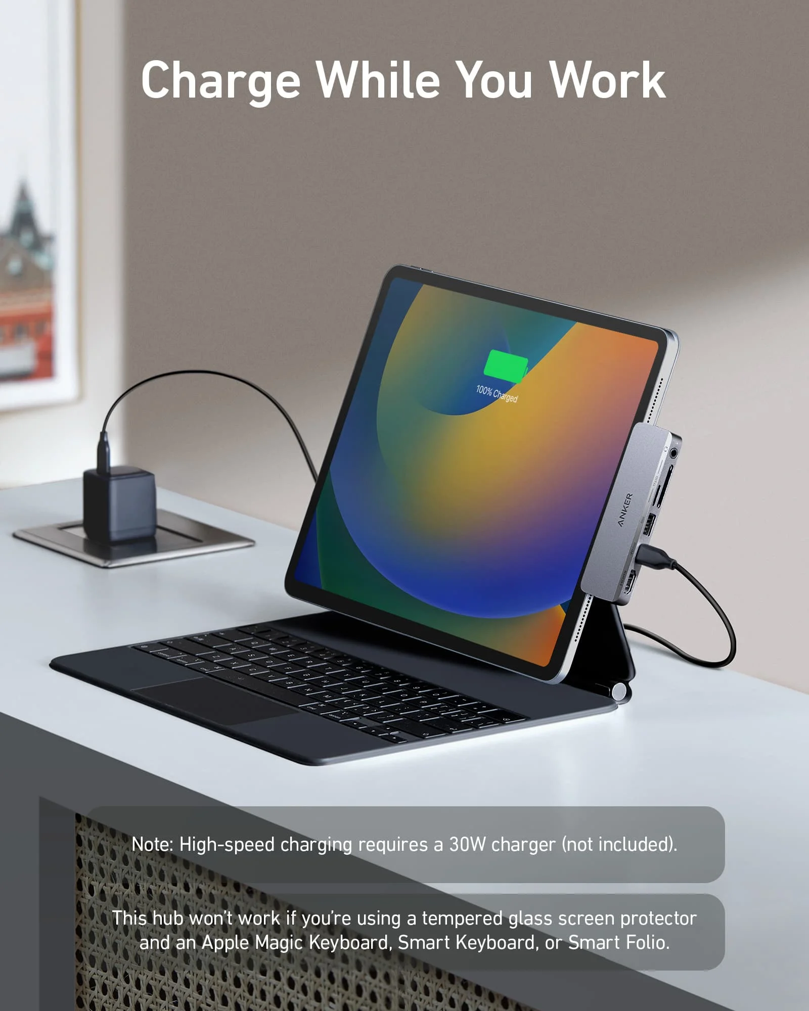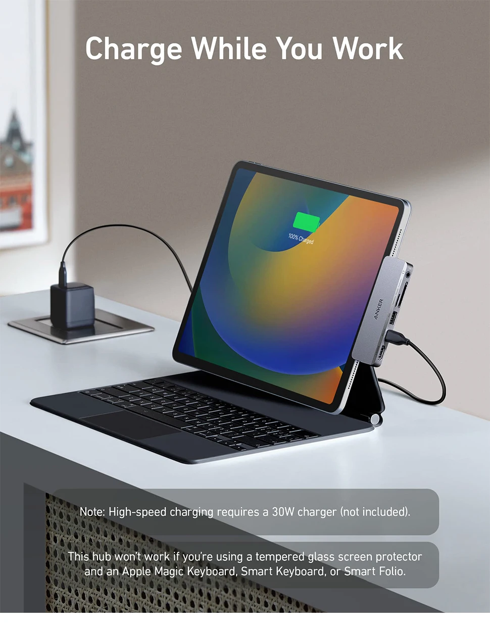 Nota: Si está utilizando un teclado Apple Magic, un teclado inteligente o un Folio inteligente y usa un protector de pantalla de vidrio templado, este producto no funcionará. Este hub solo es compatible Con el Smart Folio de Apple. No se recomienda su uso con carcasas de terceros.