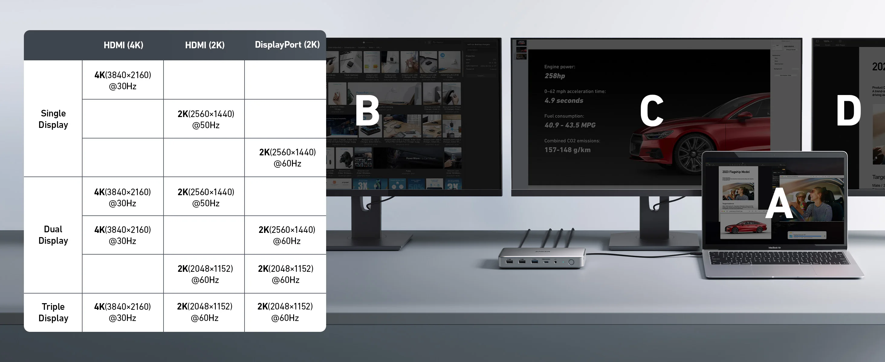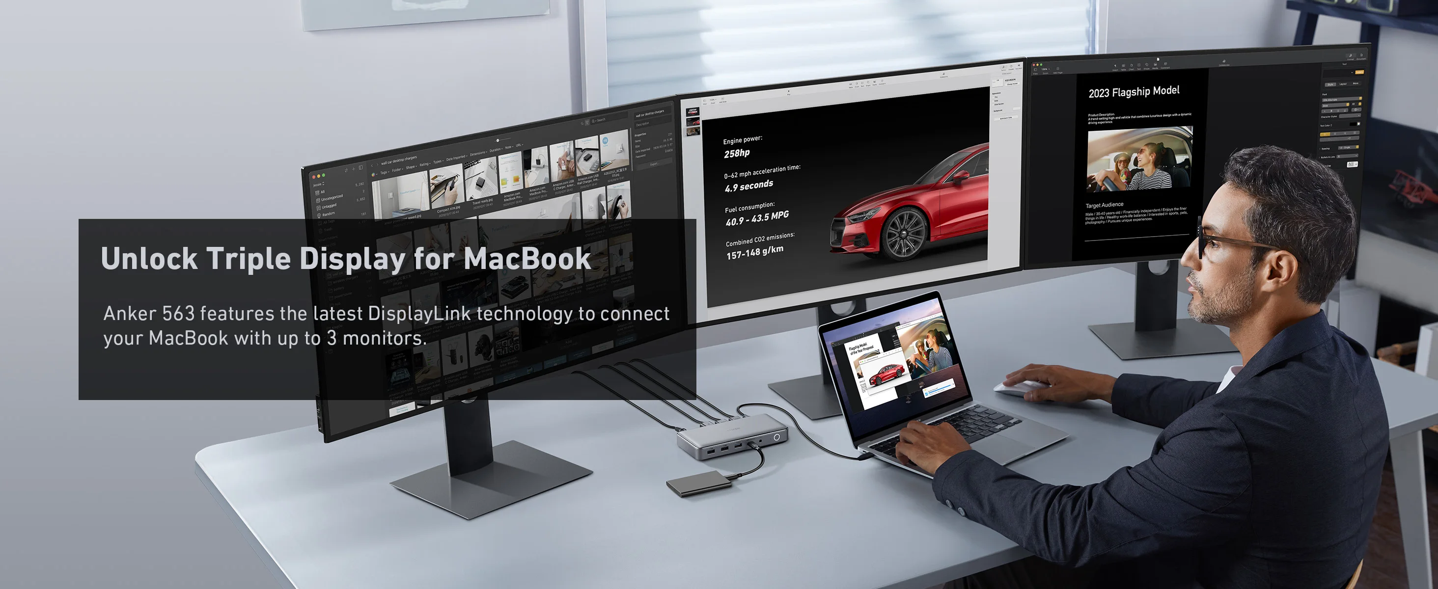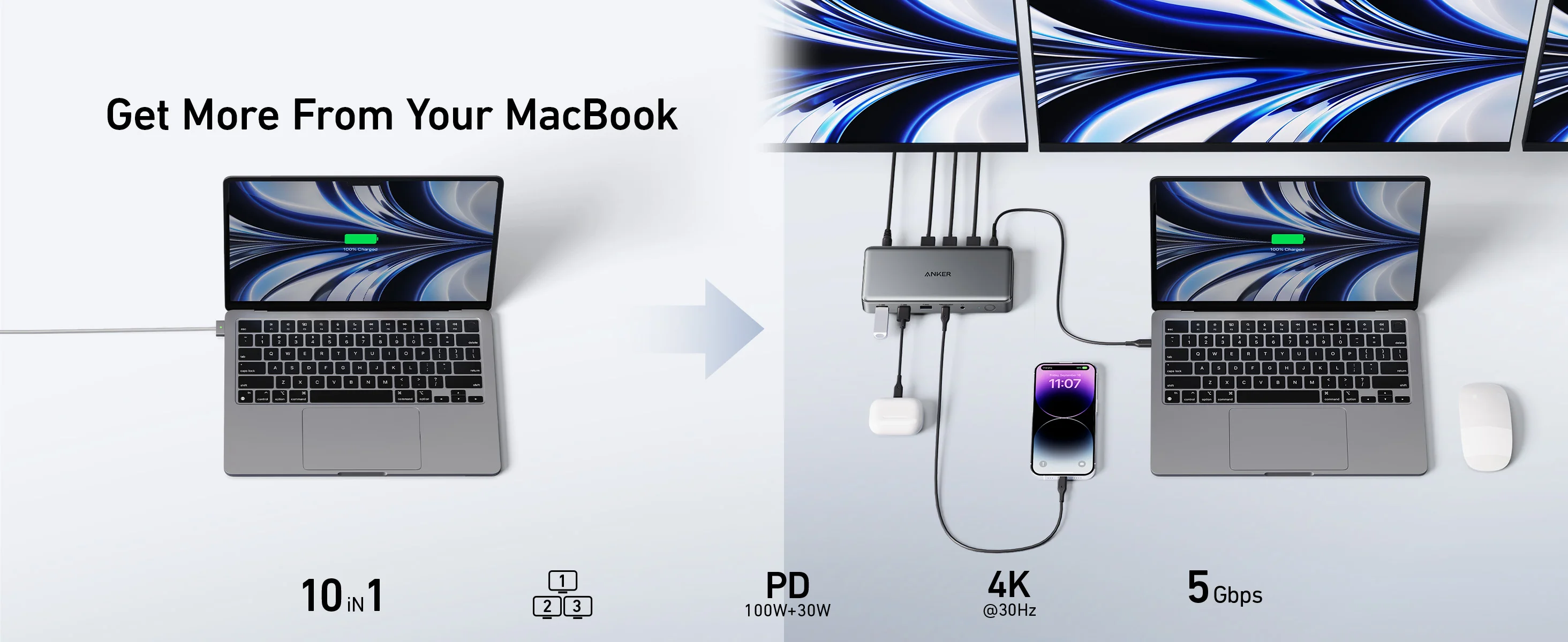Diseñado para MacBooks, incluidos los últimos modelos M1 y M2. Anker 563 cuenta con 10 puertos potentes para conectar hasta 3 monitores y cualquier otra cosa que necesite para su estación de trabajo.