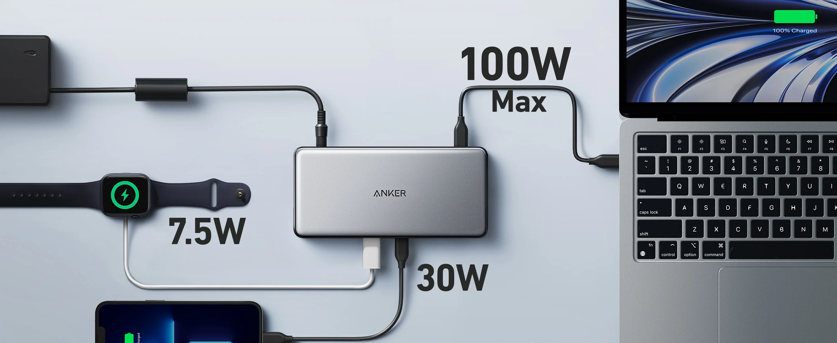 Soporta hasta 100W de carga para su ordenador portátil conectado-eso es suficiente energía para cargar rápidamente prácticamente cualquier ordenador portátil de su tipo, incluyendo los MacBooks más recientes. Incluso puede cargar su teléfono al mismo tiempo a través del puerto de entrega de energía de 30W a la vez.