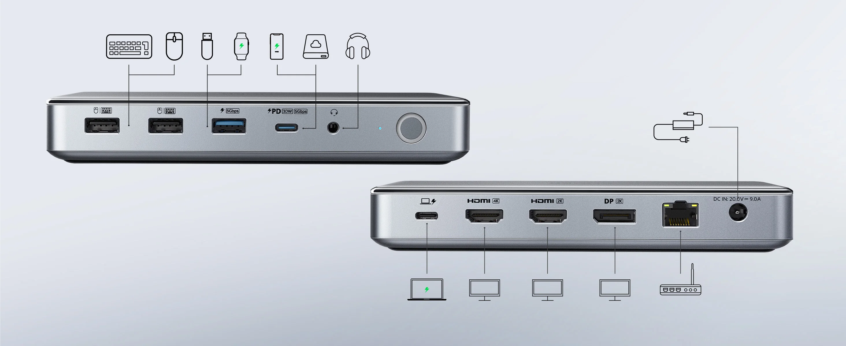 Convierta solo uno de los puertos de su computadora portátil en 2 puertos HDMI, un DisplayPort, un puerto de entrega de energía de 100W (se conecta al host), un puerto de generación 1 de 3,1 de la serie 1 de la versión 1 de la versión 1 de la versión 1, un puerto de 3,1 de 1. ª generación, 2 puertos de 2,0 de 1. ª generación, un puerto Ethernet y un puerto de entrada/salida AUX.