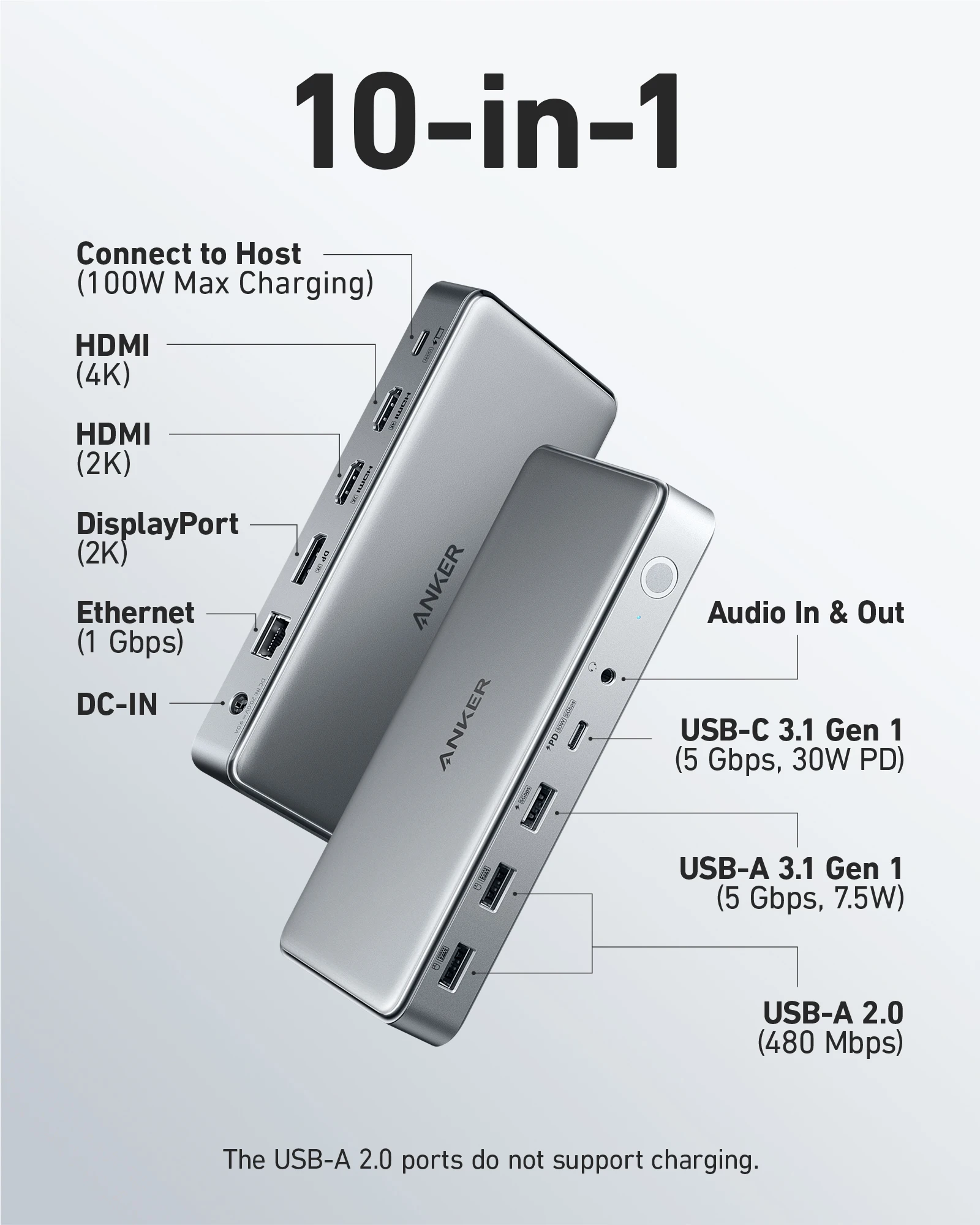Comprar Anker-estación de acoplamiento de 563 USB-C, adaptador de acoplamiento de pantalla Triple 10 en 1 para M1 MacBooks, HDMI Dual y puerto de visualización, 100W