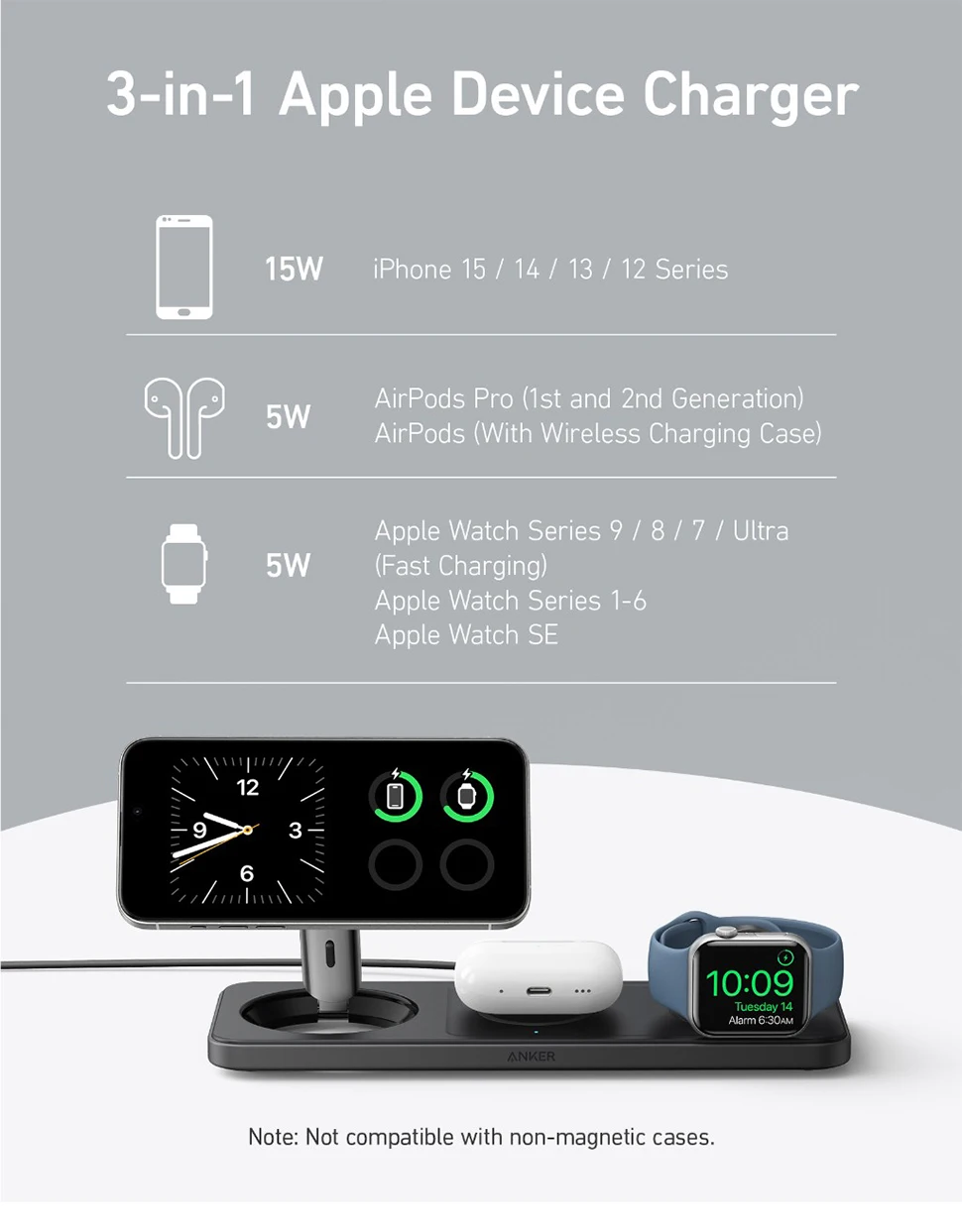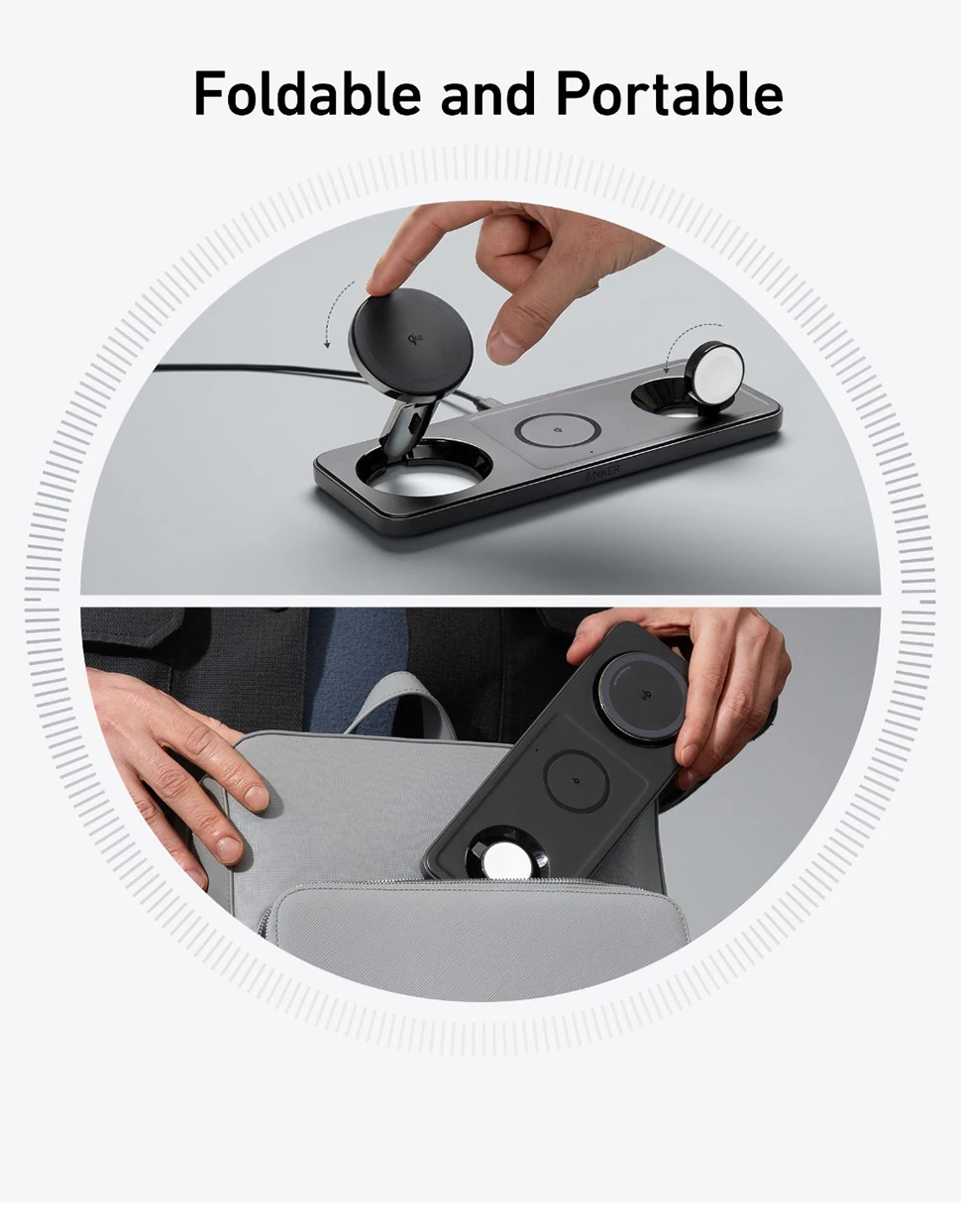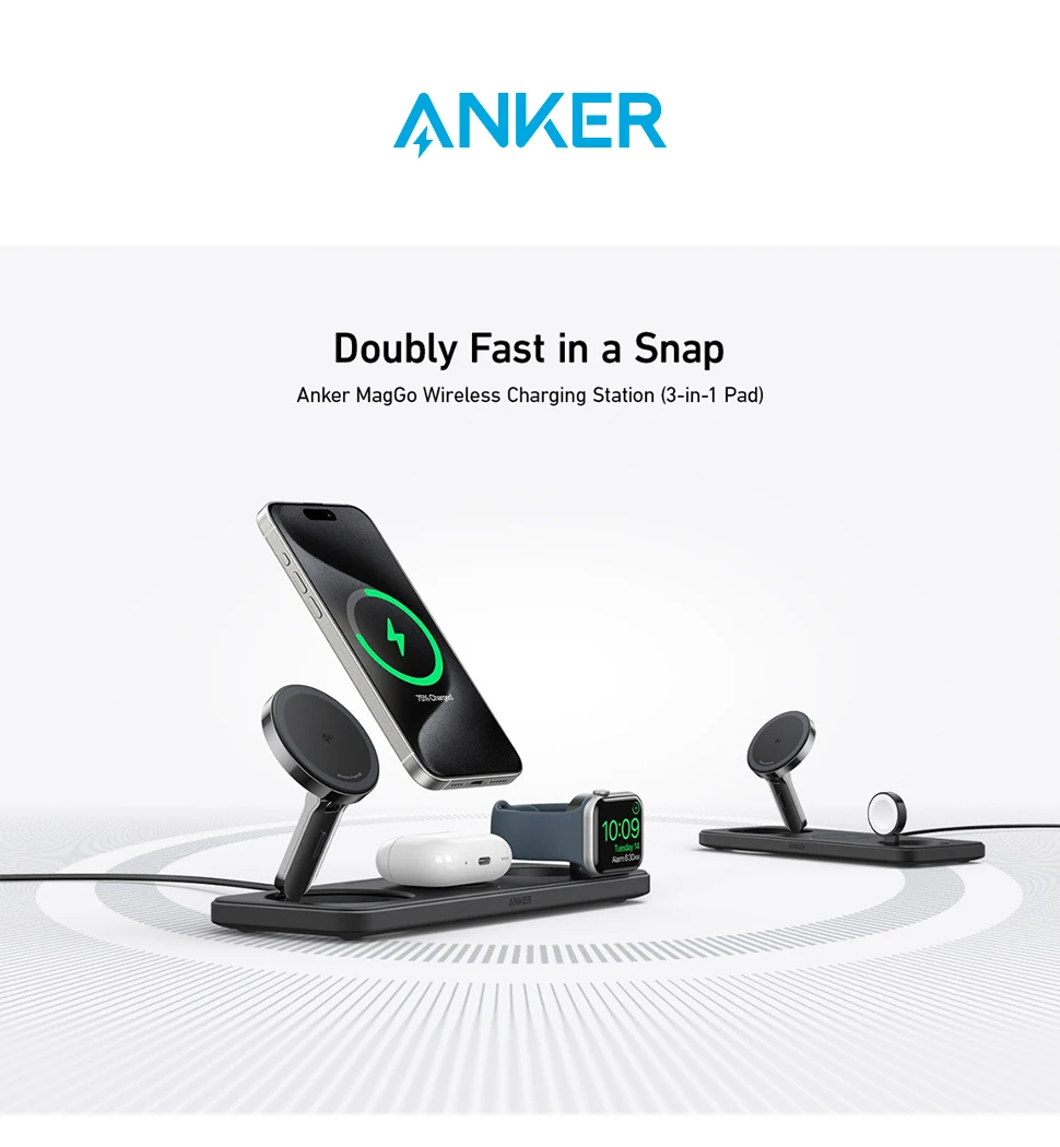 Comprar Anker-soporte de carga inalámbrico MagGo 3 en 1, plegable, con certificado Qi2, para iPhone 15/14/13/12, AirPods, Apple Watch
