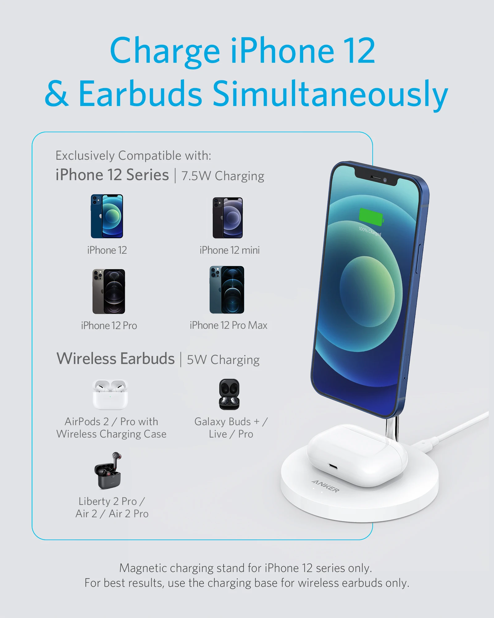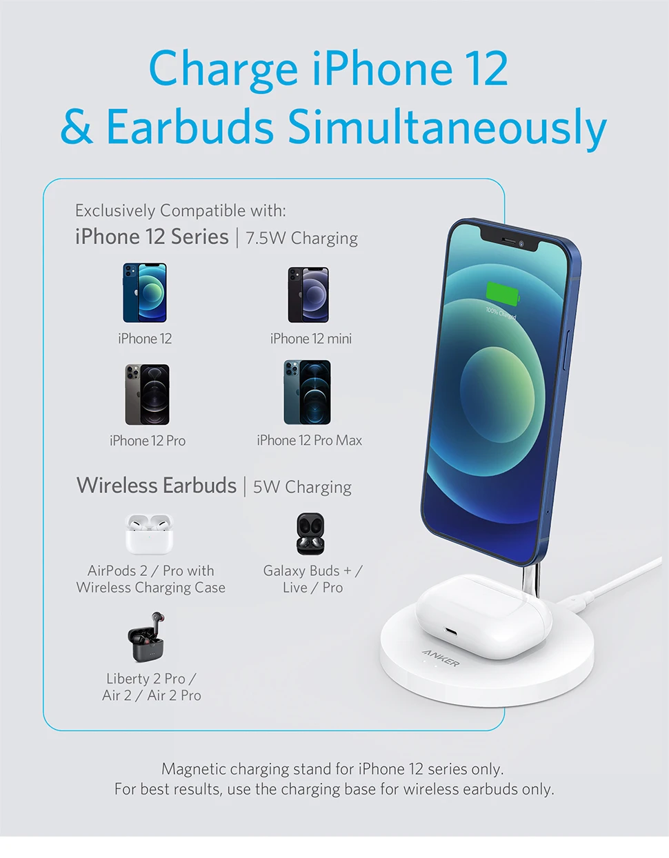 Diseñado para cargar la serie iPhone 12 y AirPods al mismo tiempo.