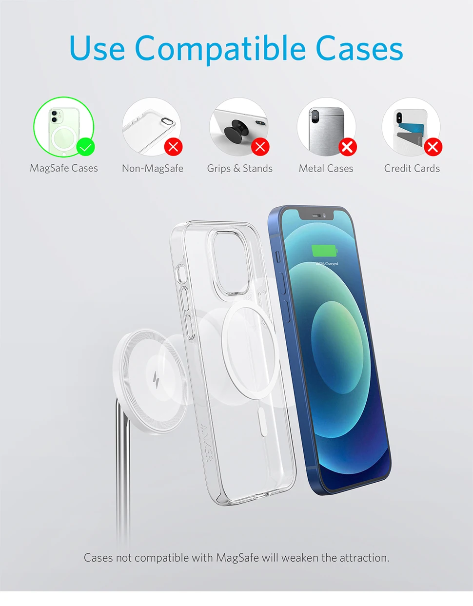 -No compatible con fundas de teléfono que no sean MagSafe. Las carcasas hechas de metal y los accesorios como imanes, tarjetas, llaves y agarres pop interferirán con la carga.
