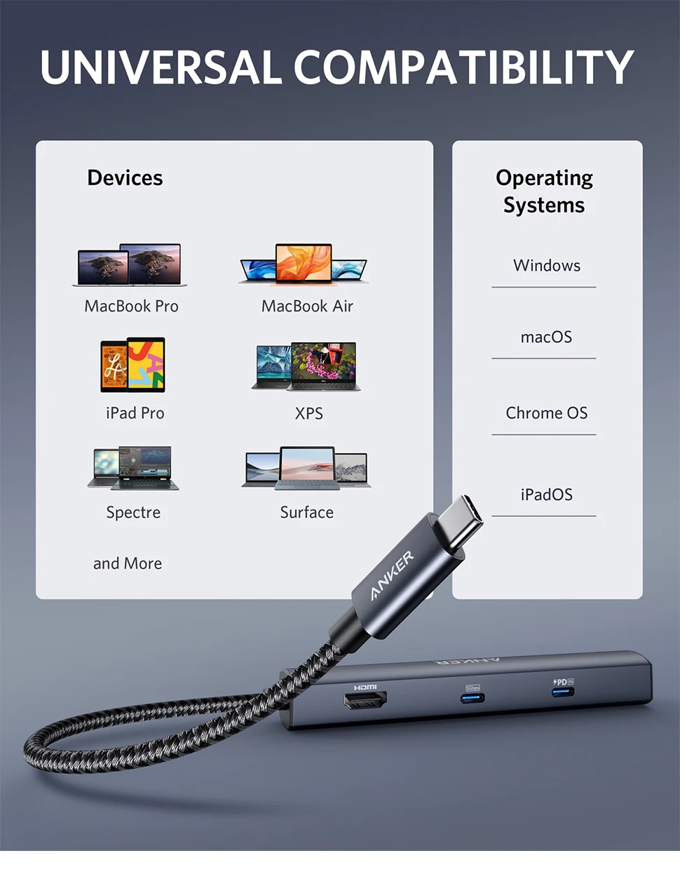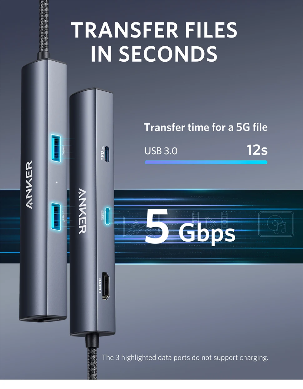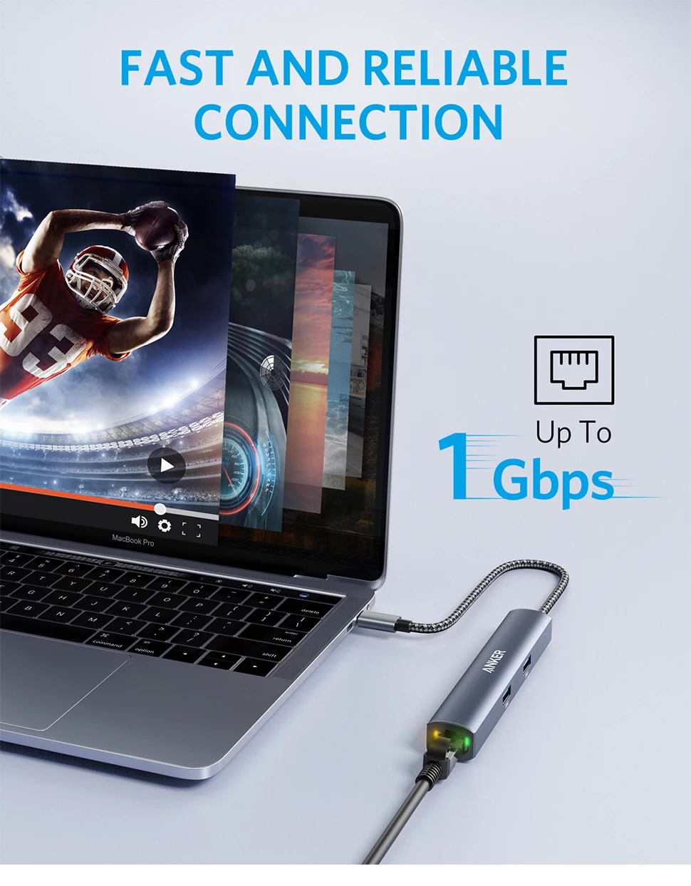 Equipado con un puerto de entrada Power Delivery, un puerto HDMI, un puerto Ethernet, un puerto de datos USB-C y 2 puertos de datos USB.