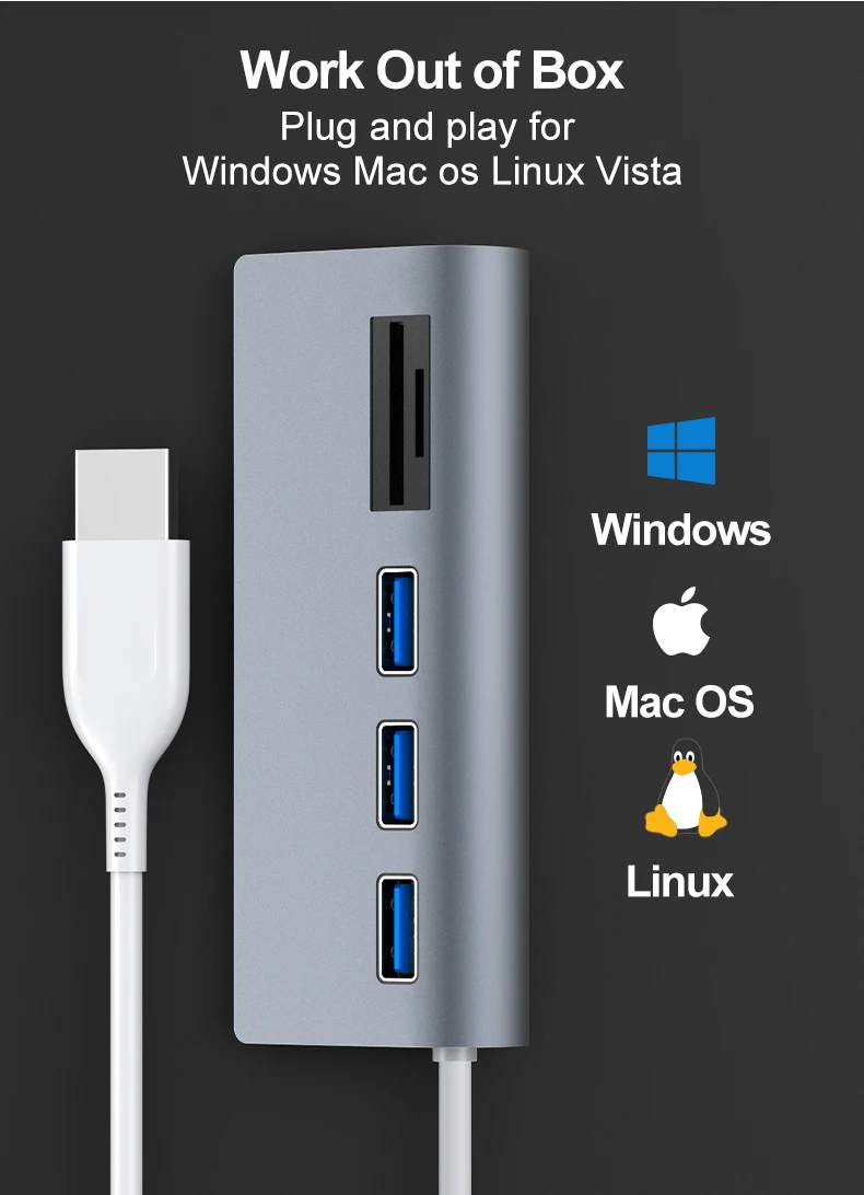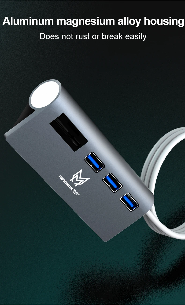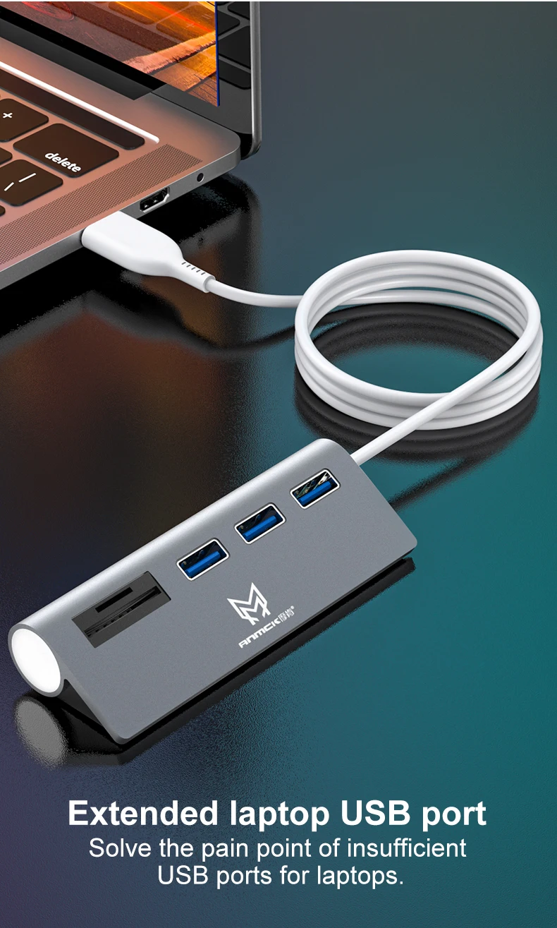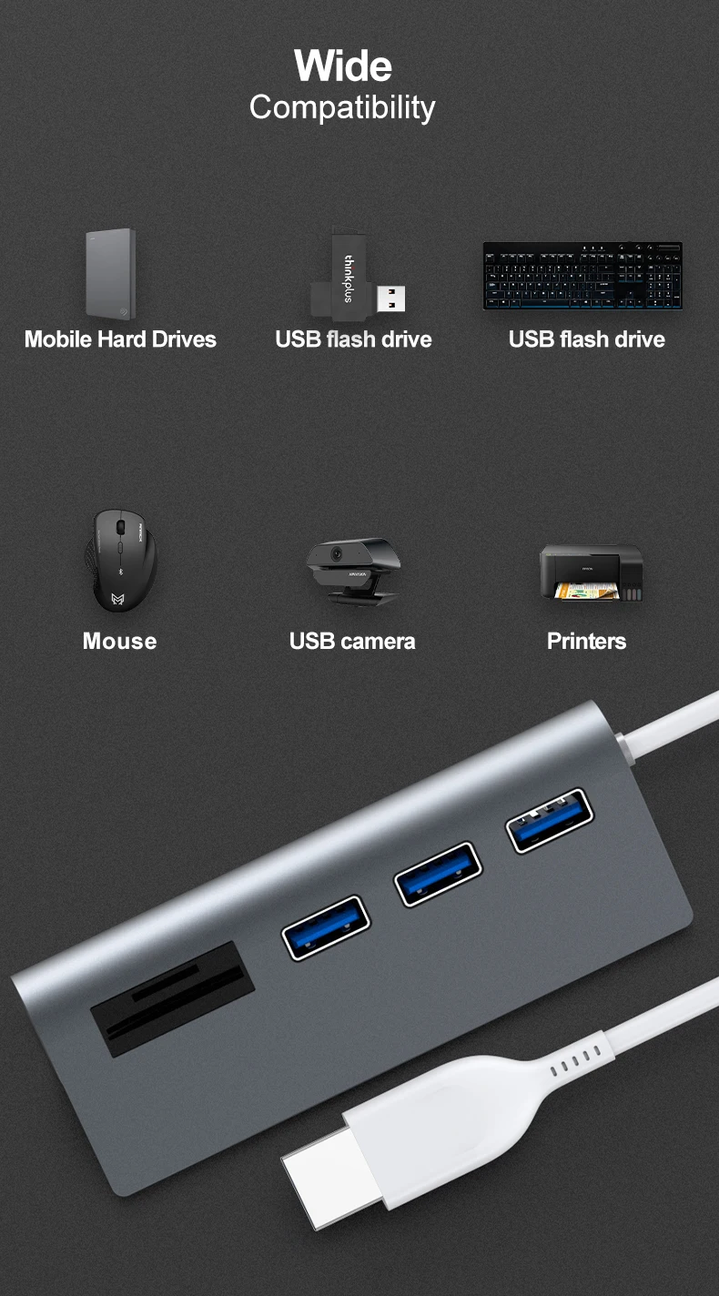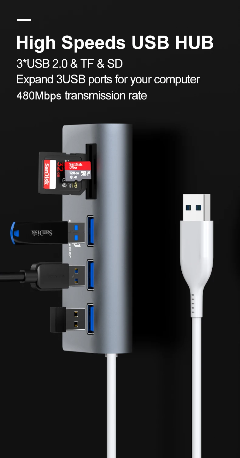 2. Transferencia de supervelocidad USB 2,0 HUB: los 3 puertos USB 2,0 admiten velocidades de transferencia de datos de hasta 480Mbps. Ranuras para tarjetas Micro SD y SD compatibles con tarjetas SDSC, SDHC y SDXC, con una velocidad de lectura de hasta 480 Mbps.