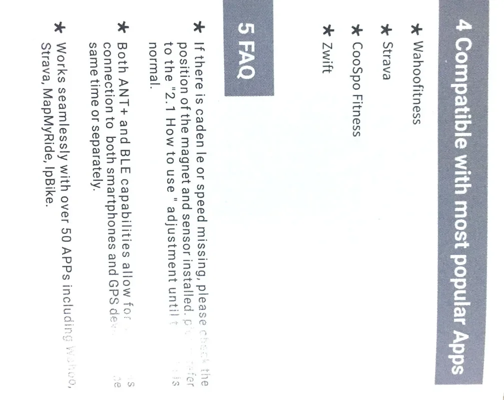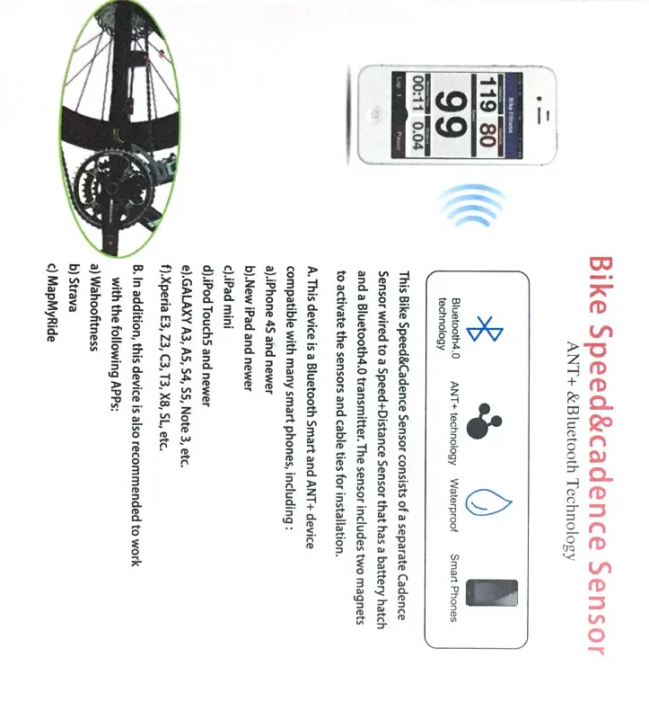 Este sensor Bike Speed & Cadence está especialmente diseñado para los amantes del ciclismo.Con él, los usuarios pueden conocer en realidad su velocidad, cadencia y distancia de conducción.Al mismo tiempo, el producto funciona con las aplicaciones de ciclismo más populares del mercado actual, como Strava, Wahoofitness y MapMyRide.Características del artículo:IMPERMEABLE: Grado de impermeabilidad IPX7, puede disfrutar de su conducción incluso en días lluviosos.TECNOLOGÍA BT 4.0: Este dispositivo es un dispositivo BT Smart y ANT+, ampliamente compatible con dispositivos inteligentes con BT 4.0 o más nuevo, para Android 4.3 o más nuevo, para IOS 6.0 o más nuevo.Los datos de velocidad/cadencia/distancia se pueden mostrar en su teléfono móvil.SEGUIMIENTO ACTIVO: Cuando conduzca, los datos de velocidad, cadencia y distancia del ciclismo se mostrarán en su dispositivo inteligente.INICIO AUTOMÁTICO: Cuando conduce, el dispositivo puede transmitir y sincronizar automáticamente con su teléfono inteligente y también puede apagarse automáticamente cuando no conduce, ahorrando mucha energía.BAJO POTENCIA: Este artículo funciona con 1 batería CR2032 y puede durar aproximadamente 6 meses.(Aviso: debido al control de aire, la batería no está incluida)APLICACIÓN COMPATIBLE: el producto funciona con las aplicaciones de ciclismo más populares del mercado, como Strava, Wahoofitness y MapMyRide.Especificación:Modelo de batería: 1 * CR2032 (Aviso: debido al control de aire, la batería no está incluida)Requisitos del dispositivo: BT 4.0 o más nuevo, para Android 4.3 o más nuevo, para IOS 6.0 o más recienteMaterial: ABSTamaño del paquete: 123 * 111 * 44 mm / 4,8 * 4,4 * 1,7 pulgadasPeso del paquete: 90 g/3,17 ozLista de paquetes:1 * Sensor2 * imán1 * conjunto de accesorios de montajeViene con caja al por menor