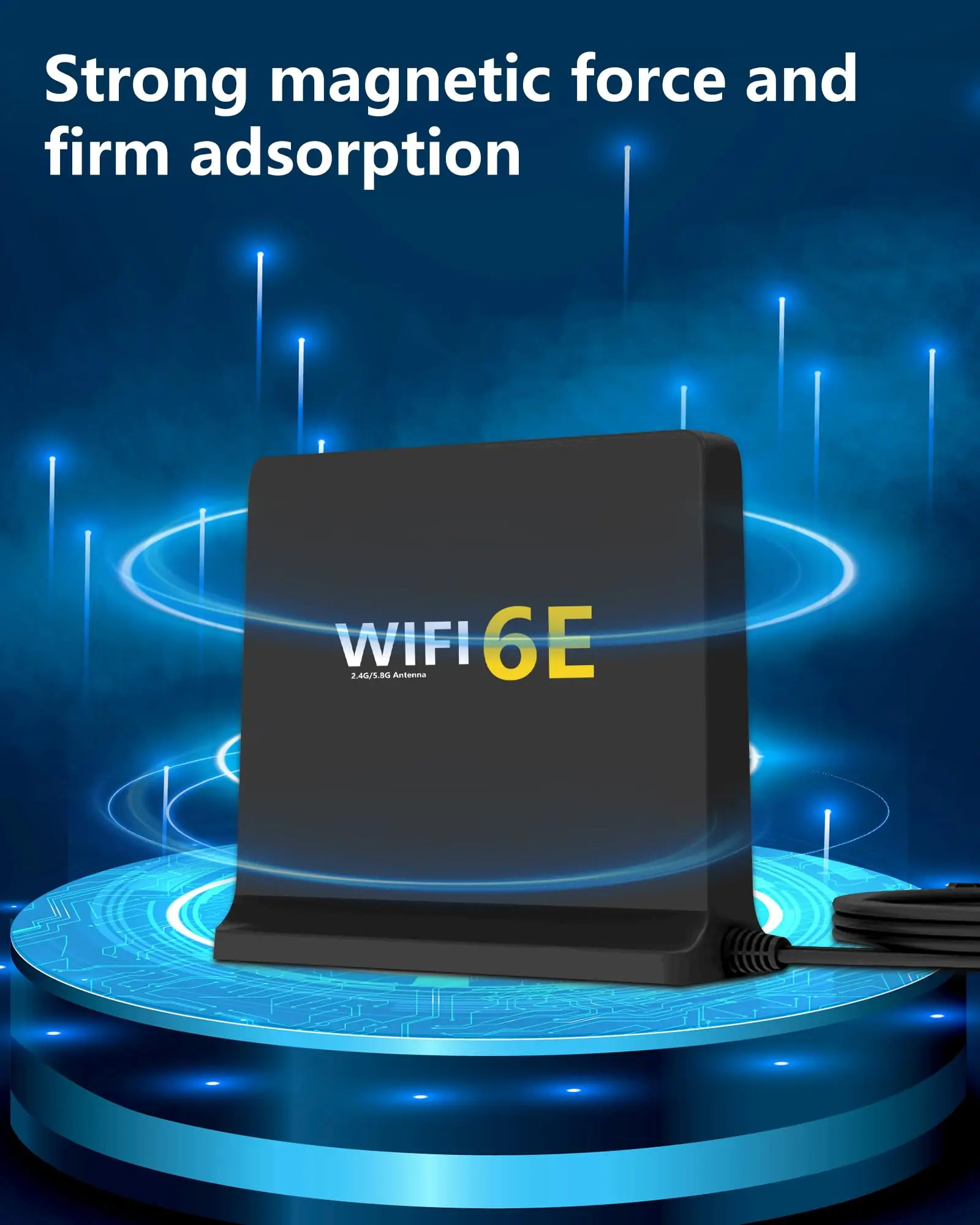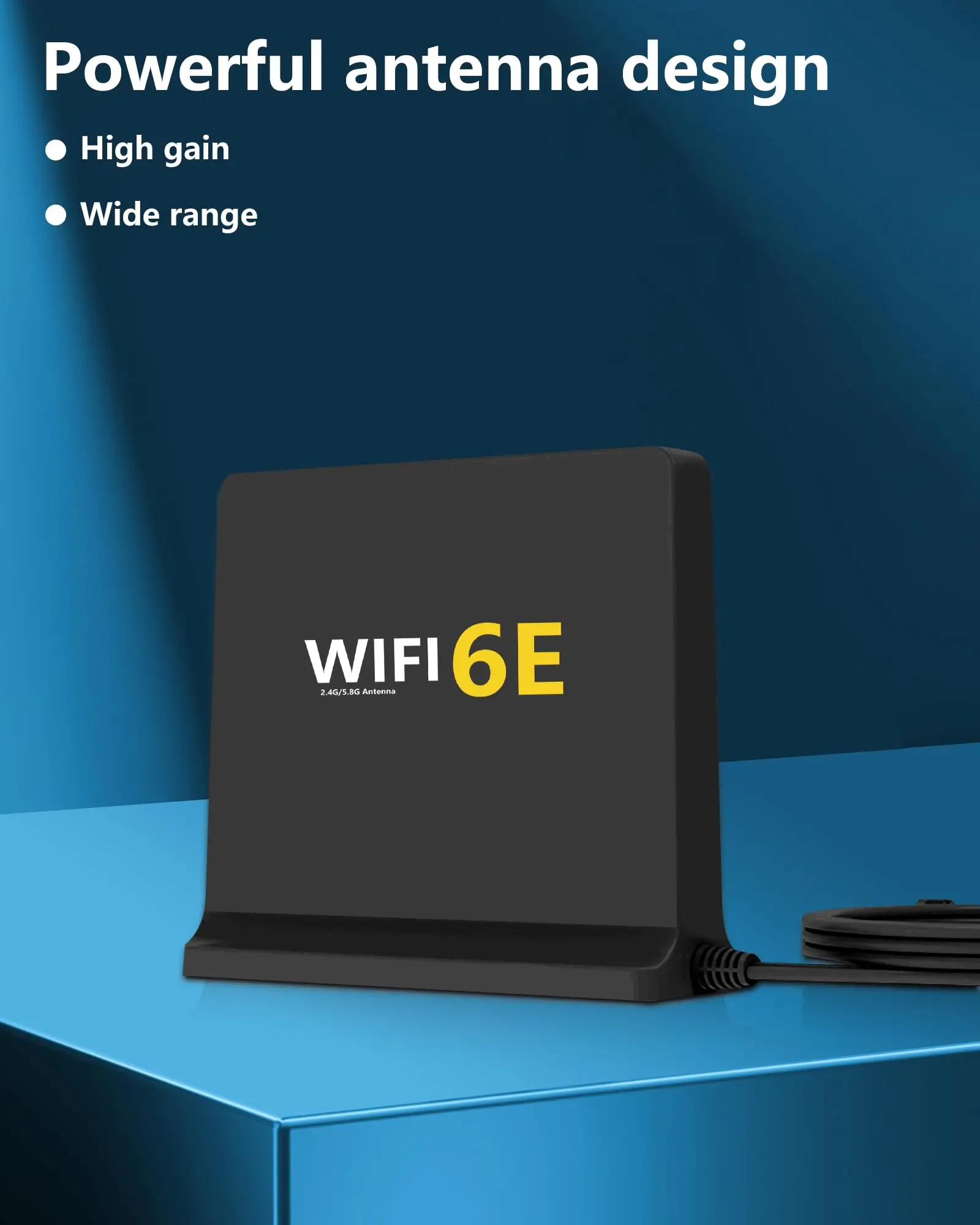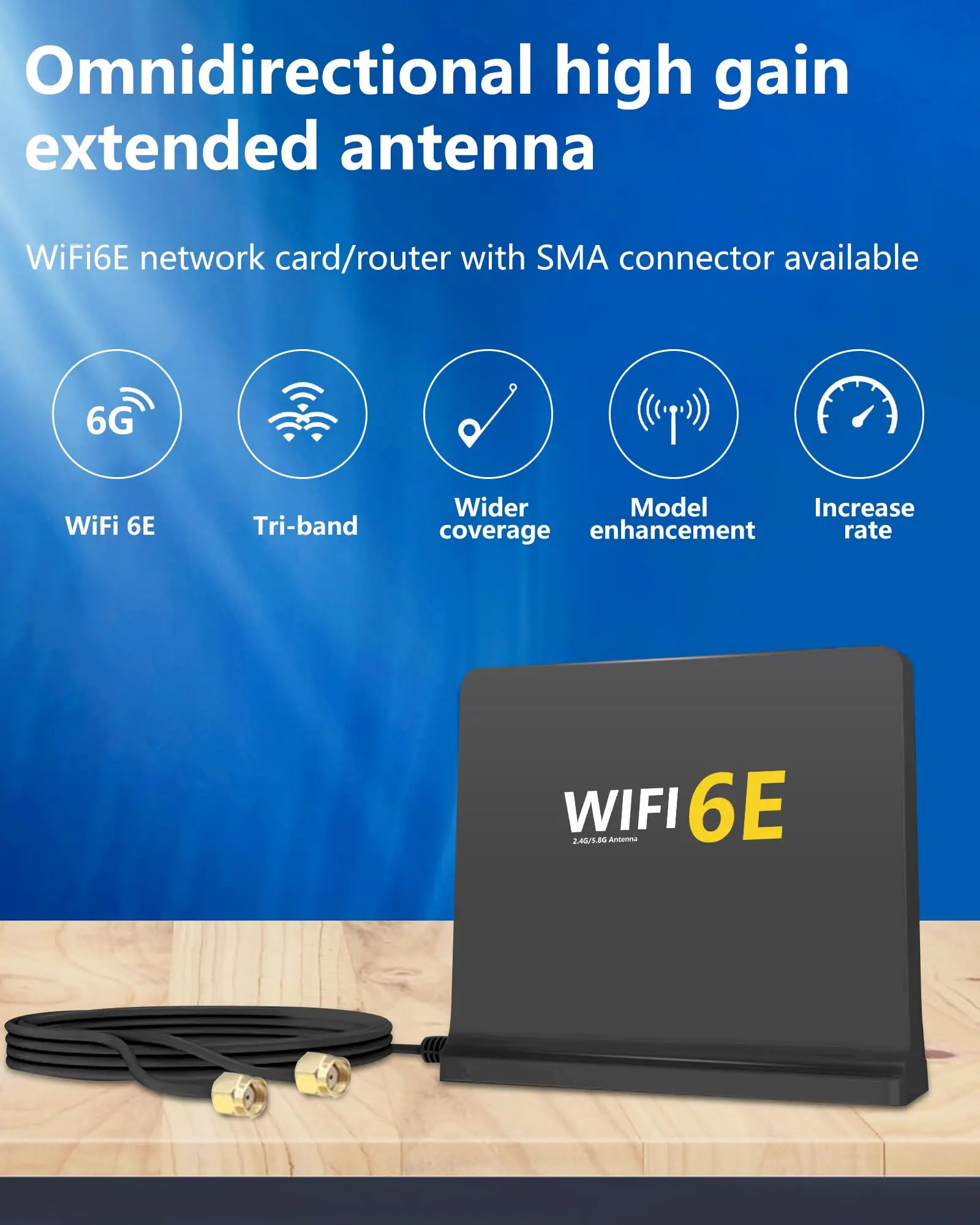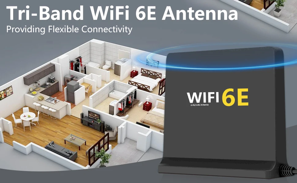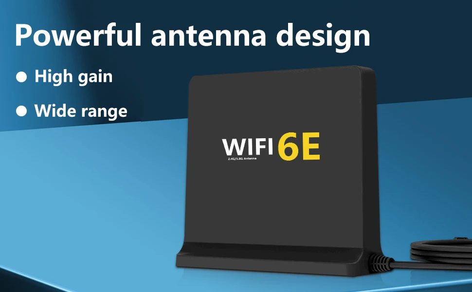 WiFi6E es una nueva antena WiFi 6E omnidireccional interior trivel de 2,4 GHz/5 GHz/6E de alta ganancia con dos conectores macho RP-SMA.Esta es una antena de tres bandas y funciona con bandas Wi-Fi de 2,4 GHz, 5 GHz y 6E.
