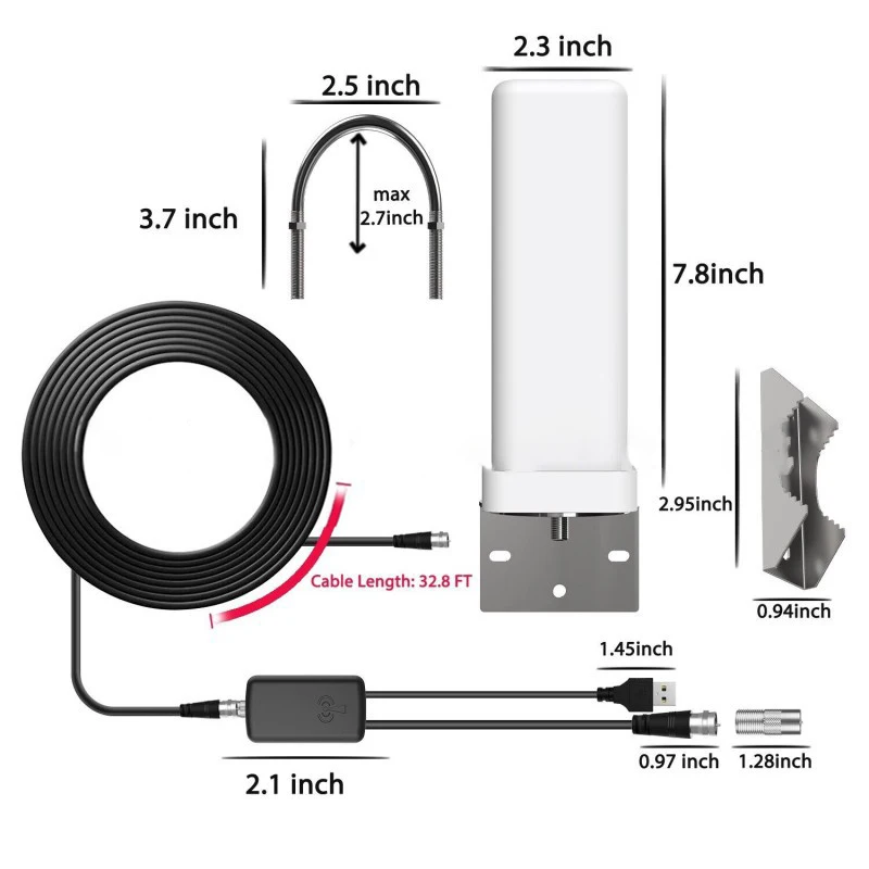 Lista de productos: Antena + adaptador universal para estándares europeos y americanos + amplificador + cable de 10m + tornillos de fijación