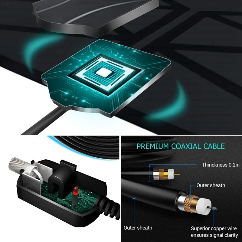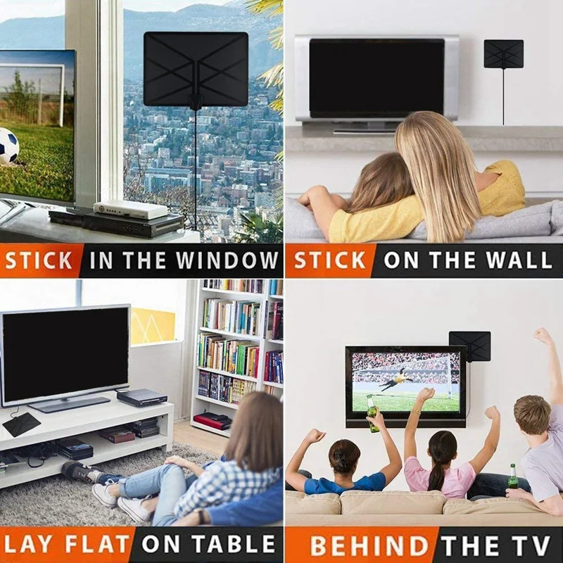 Ultra-Thin and Easy To Use - TV Antenna light as a feather, allows you to place it almost anywhere and no power required. With the Unique Plastic Shell and Silver Slurry imported from the US, all the accessories are all pure copper to assure the contact loose. Digital HDTV antenna with 16.5ft coax cable,, Amplifier Signal Booster, Spare Sticker. Installation is a breeze with only 3 steps: unwrap, plug it and scan channels. You can place it high on window (strongly recommended)
