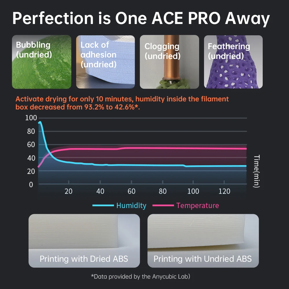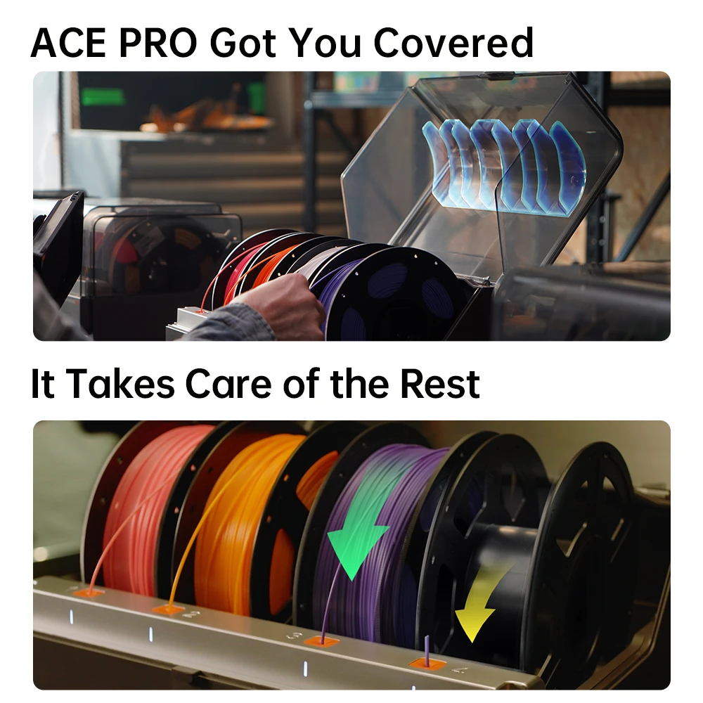 No se necesita secadora adicional, el ACE PRO admite completamente el eyen secado de filamentos las 24 horas durante la impresión para aumentar la eficiencia a otro nivel.