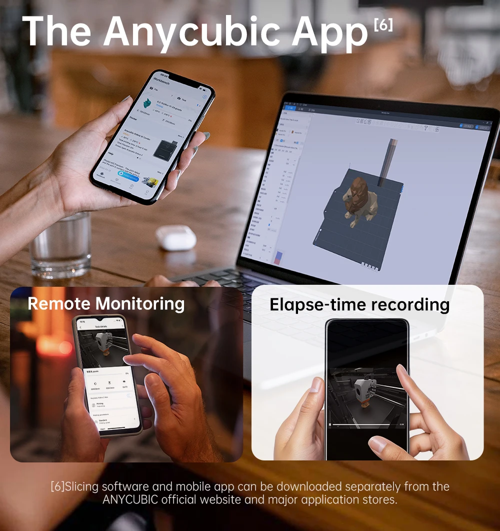 Supervise el estado de impresión en tiempo real a través de la aplicación Anycubic en sus dispositivos móviles, incluidos teléfonos móviles, tabletas y computadoras portátiles.