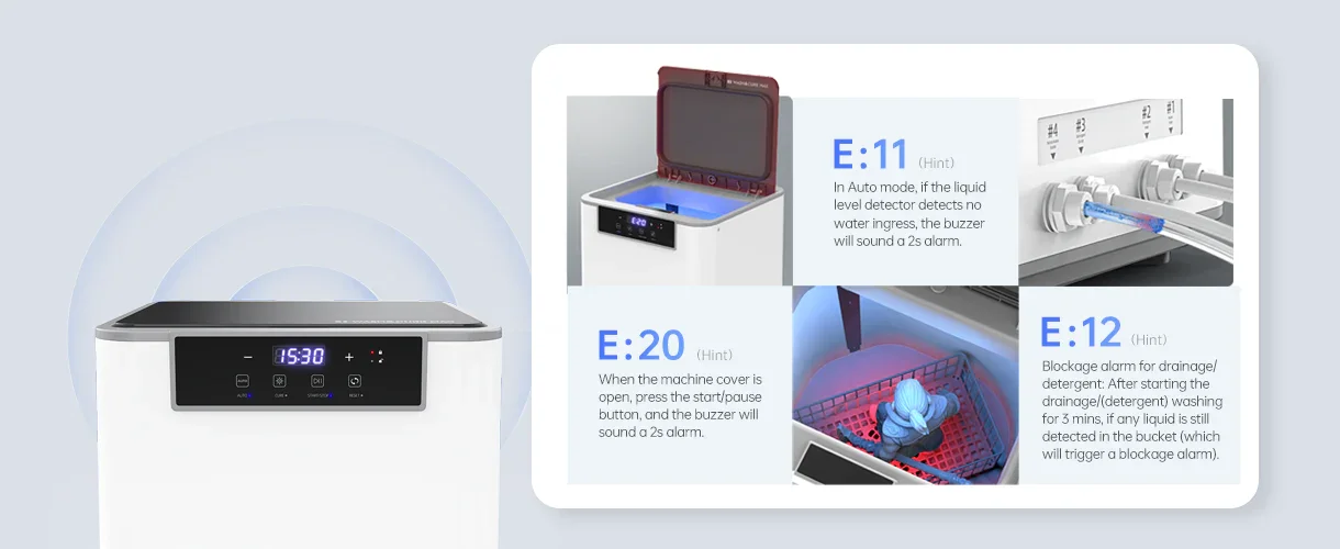 Detección inteligente de fallas y alerta para informar a los usuarios cuando las puertas no están bien cerradas, cuando el agua ha ingresado a la unidad o a las salidas se han bloqueado durante el funcionamiento.Identifica y resuelve rápidamente fallas para garantizar operaciones de lavado y curado perfectas.