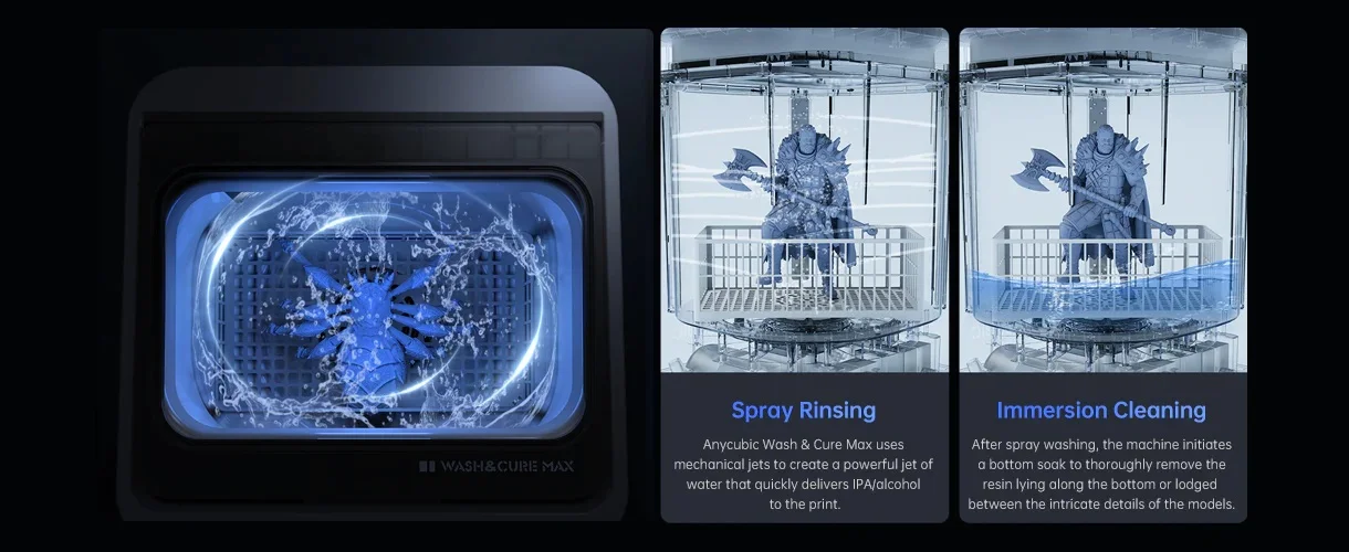 Enjuague por pulverización: Anycubic Wash & Cure Max utiliza chorros mecánicos para crear un potente chorro de agua que suministra rápidamente IPA/alcohol a la impresión.