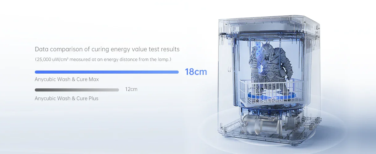 Con un 360°Plataforma de curado giratoria automática, esta máquina proporciona mayores valores de energía de curado y distancias de irradiación más largas, lo que permite un curado completo y eficiente para sus modelos.Comparación de datos de los resultados de las pruebas de valor de energía de curado (25.000 uW/cm2 medidos a una distancia de energía de la lámpara.)
