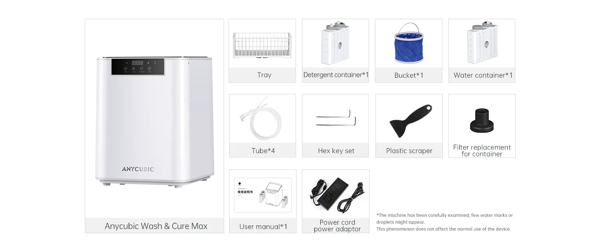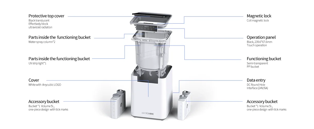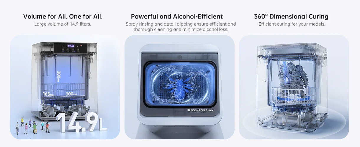 La unidad puede contener hasta 14,9 litros (15,7 cuartos.), superando los tamaños de la mayoría de las máquinas de lavado y curado del mercado.El impresionante tamaño máximo de limpieza de 300*165*300 mm (11,8”x 6,5” x 11,8”) es compatible con casi todas las impresoras 3D de resina de calidad consumer miden 13,6”(35 cm) y menos disponibles en el mercado.