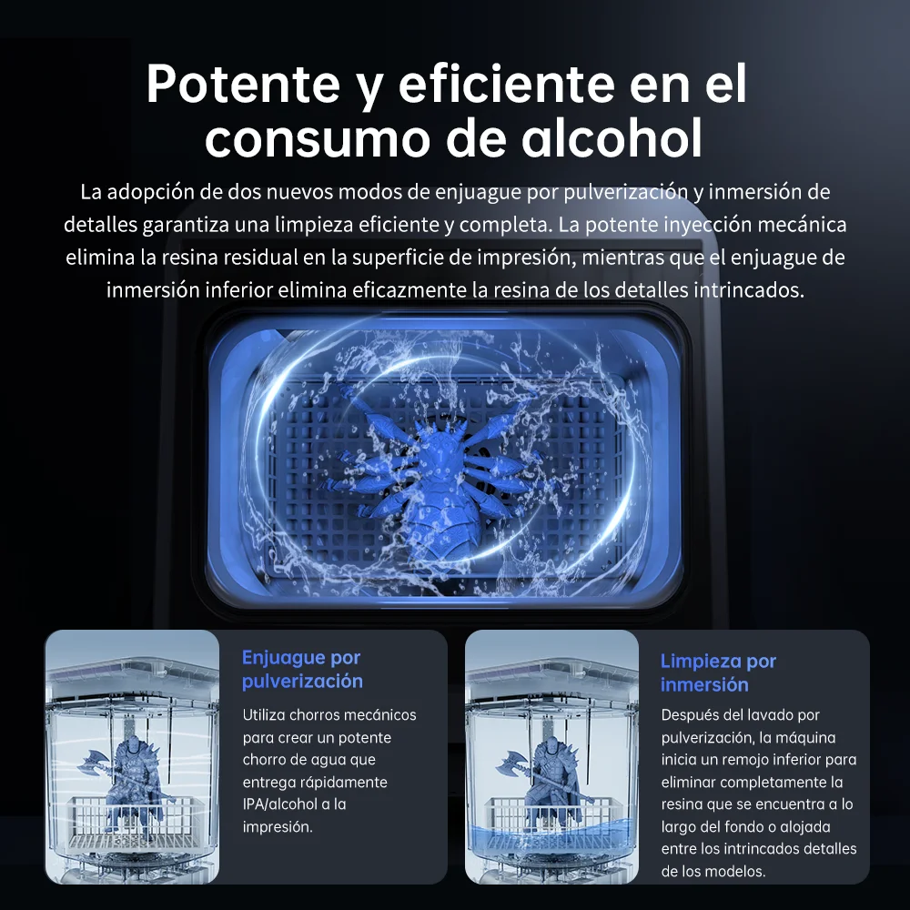 La adopción de dos nuevos modos de enjuague por aspersión y inmersión detallada garantiza una limpieza eficiente y profunda.La potente inyección mecánica elimina la resina residual en la superficie de impresión, mientras que el enjuague inferior elimina eficazmente la resina de detalles intrincados.