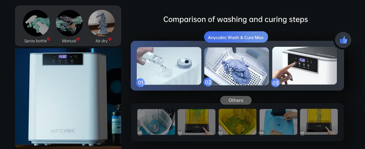 Lavado y curado completos con botón de doble función.Diga adiós al posprocesamiento que consume mucho tiempo y que consume mucha mano de obra.Experimente un procesamiento de modelos optimizado que le ahorra tiempo y esfuerzo.