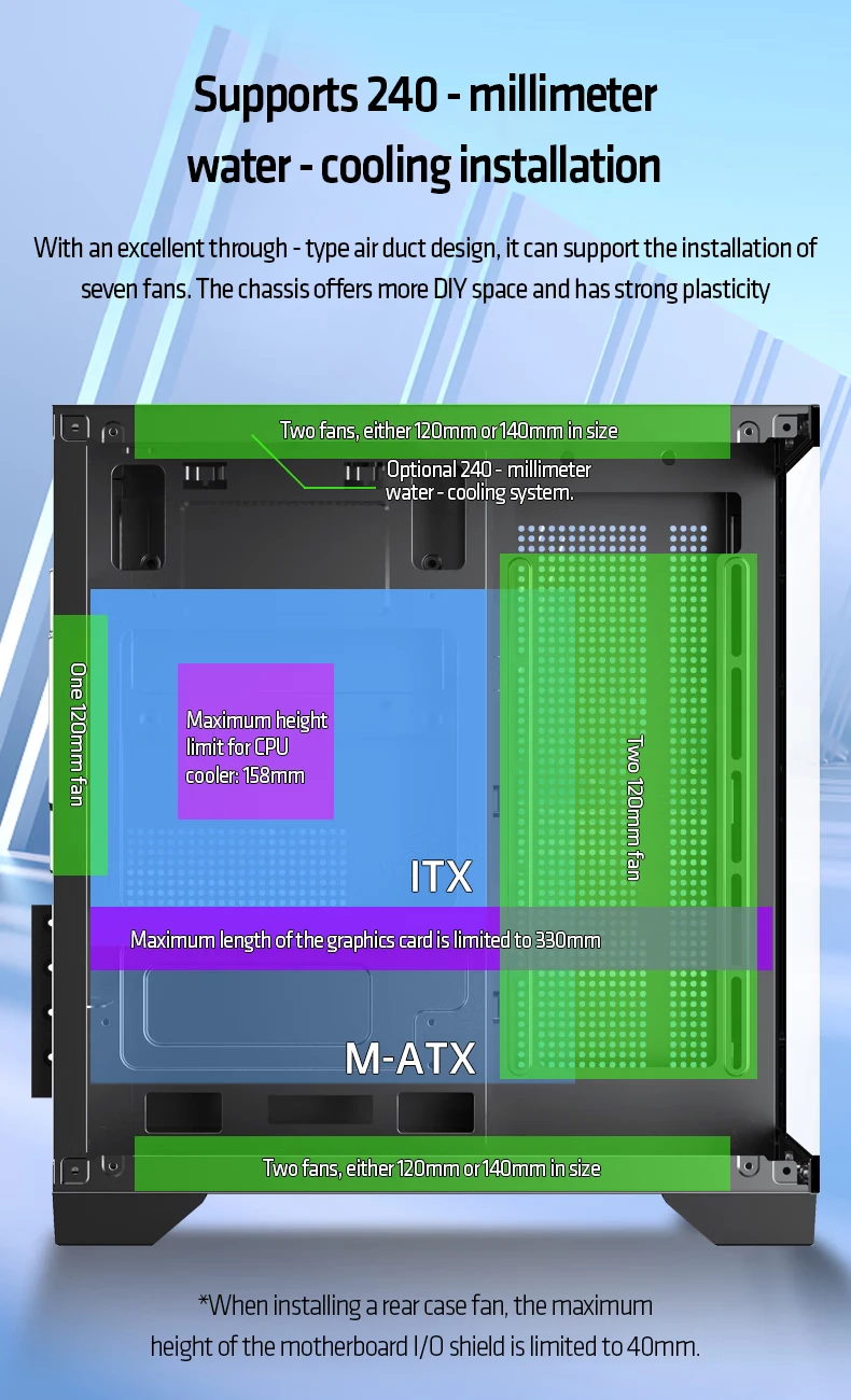 Diseño de múltiples ventiladores: soporte delantero/superior/trasero ventiladores de 120 mm/140 mm, compatible con escape con refrigeración por agua (240/360 mm).