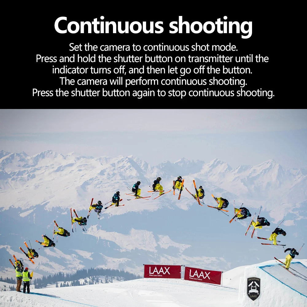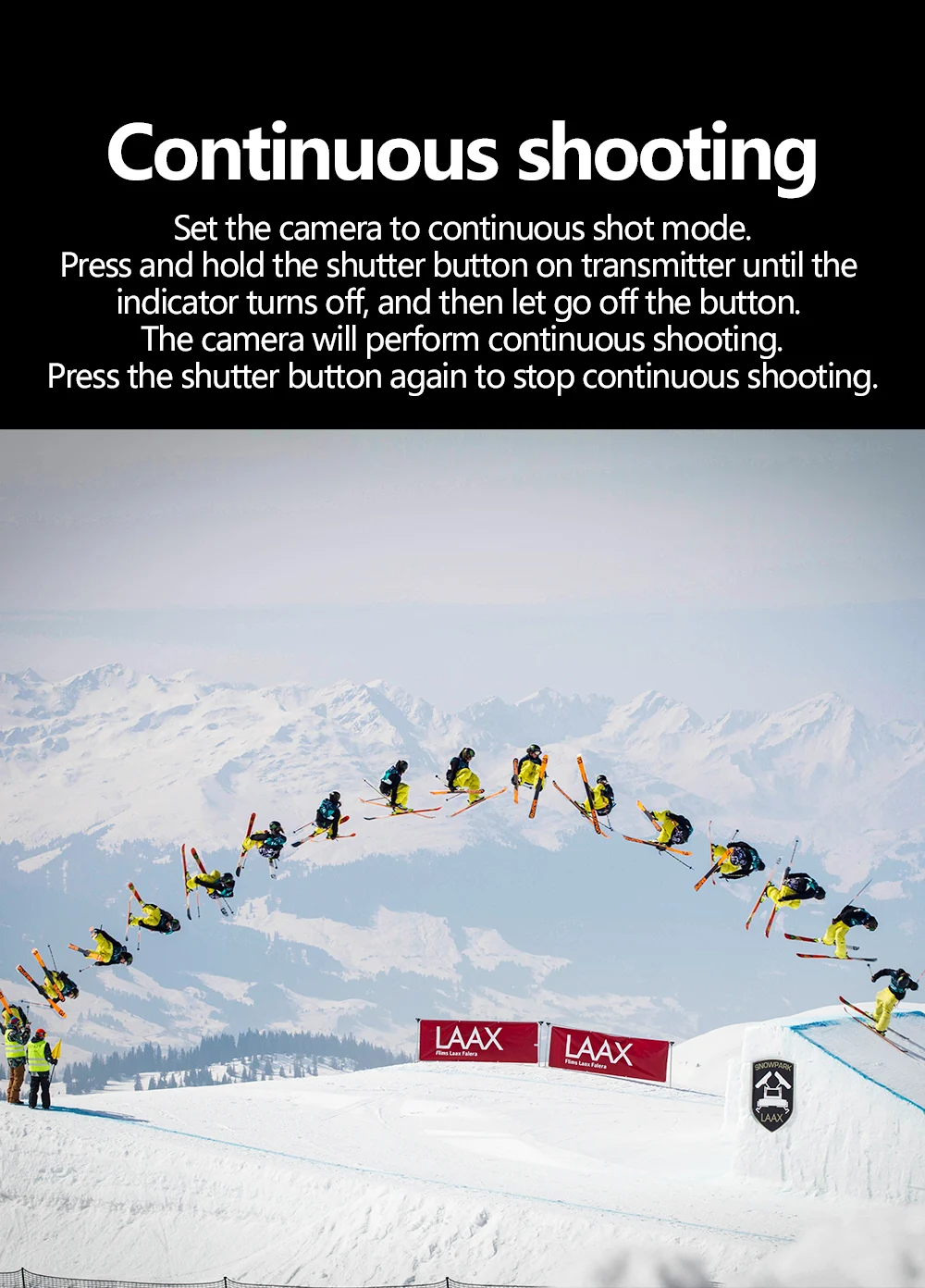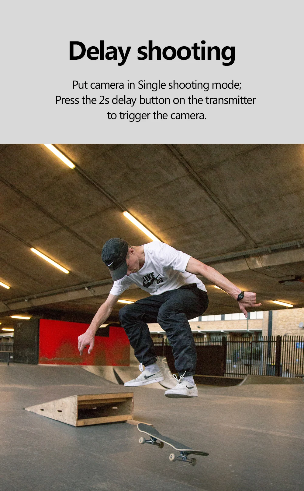 El transmisor puede controlar el receptor de forma inalámbrica para realizar enfoque automático, disparo único, liberación retardada y liberación continua.(el receptor no necesita ocupar la zapata de la cámara).