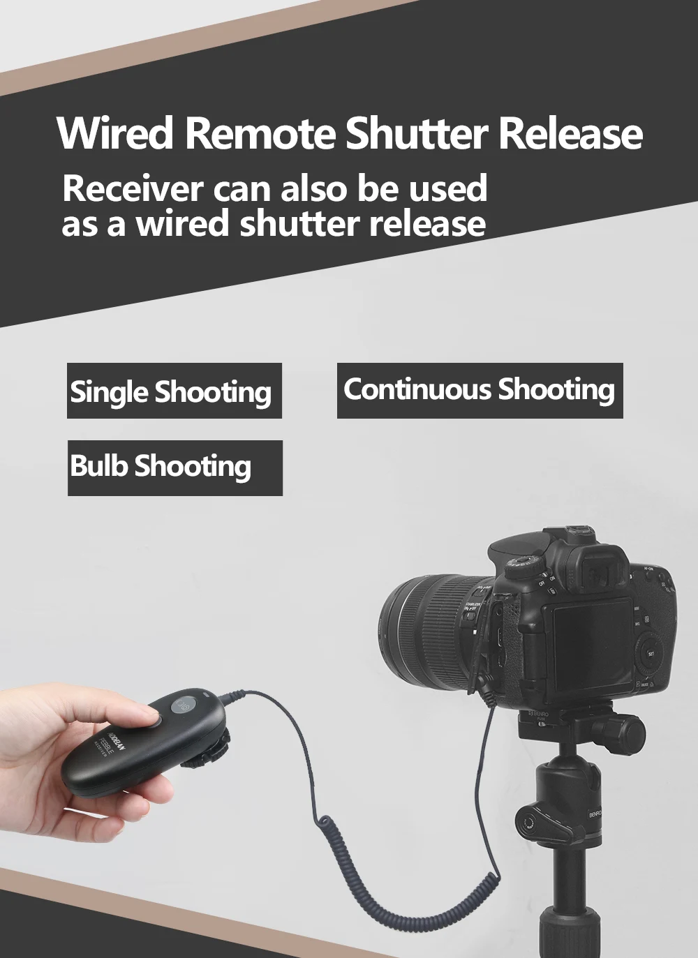 El receptor también se puede utilizar como control remoto de obturación con cable para lograr enfoque automático, disparo único y liberación continua.
