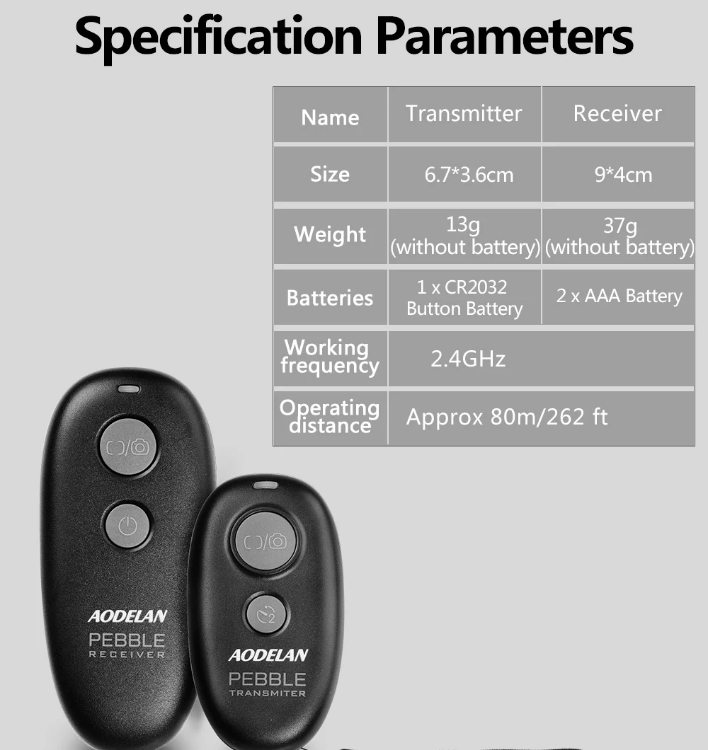 El control remoto inalámbrico del obturador AODELAN PEBBLE consta de un transmisor y un receptor.