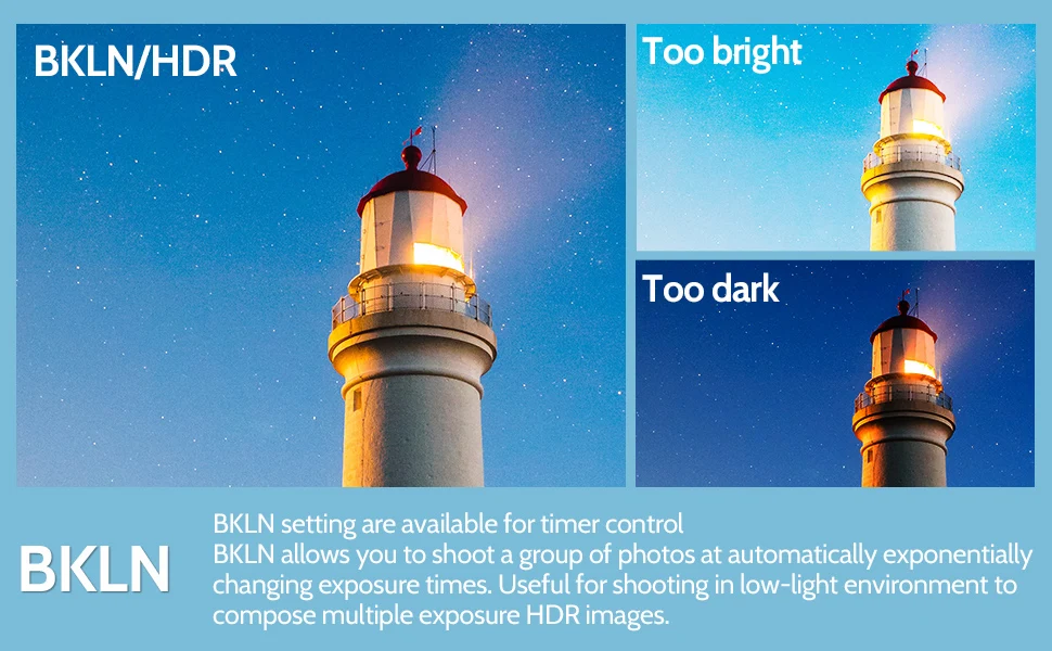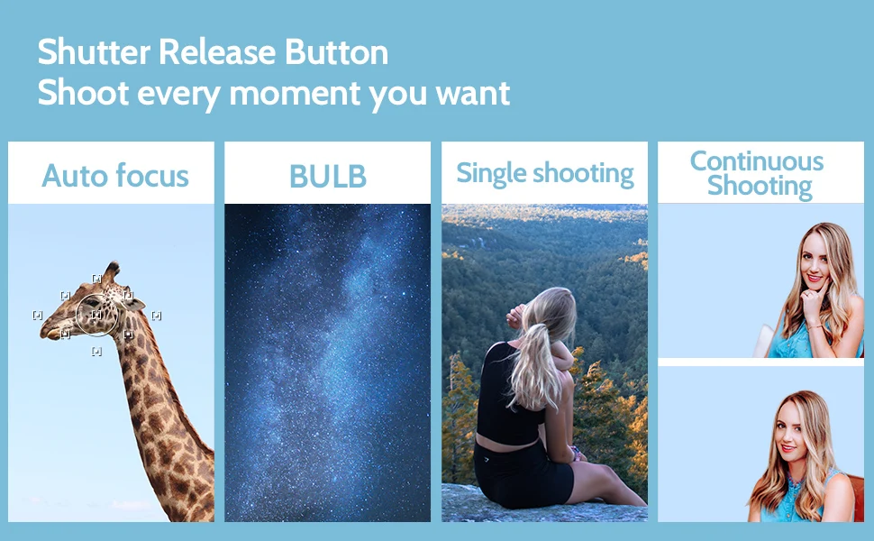 * En el modo temporizador, retardar la exposición, la exposición larga, el intervalo, la función de número de exposición se pueden programar juntas para capturar los momentos hermosos con intervalos de tiempo repetidos y disparos repetidos