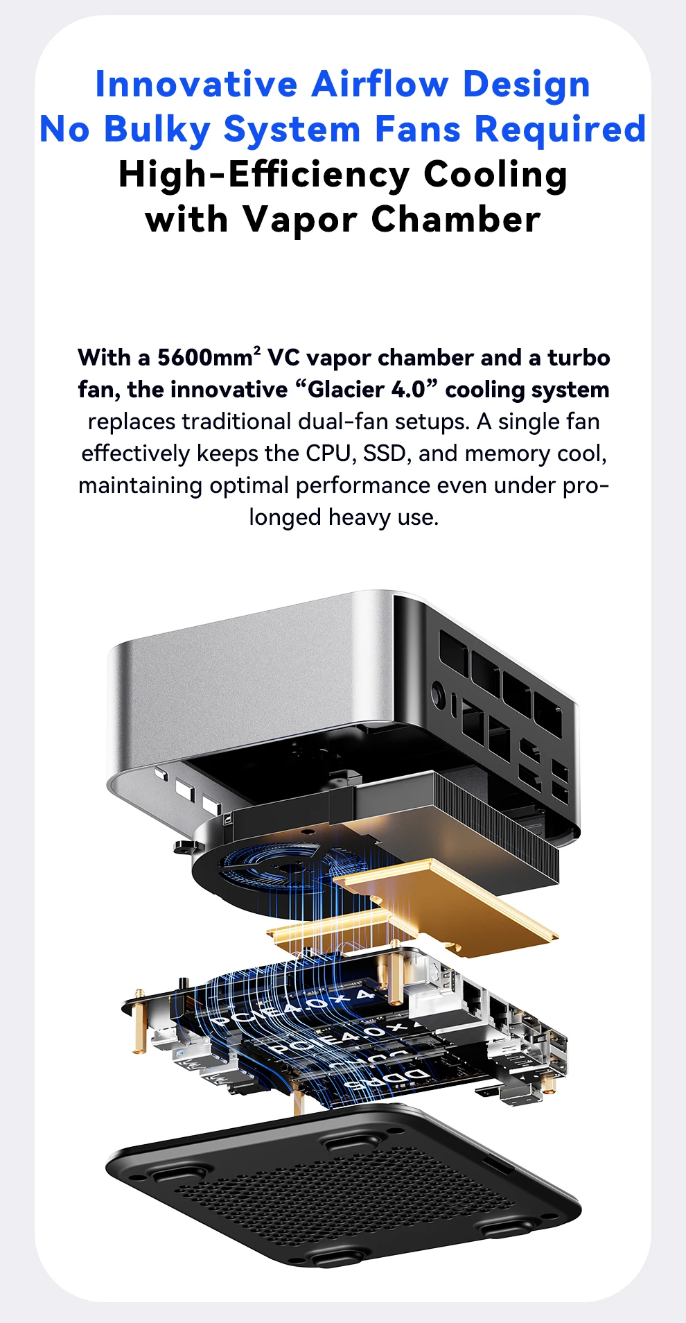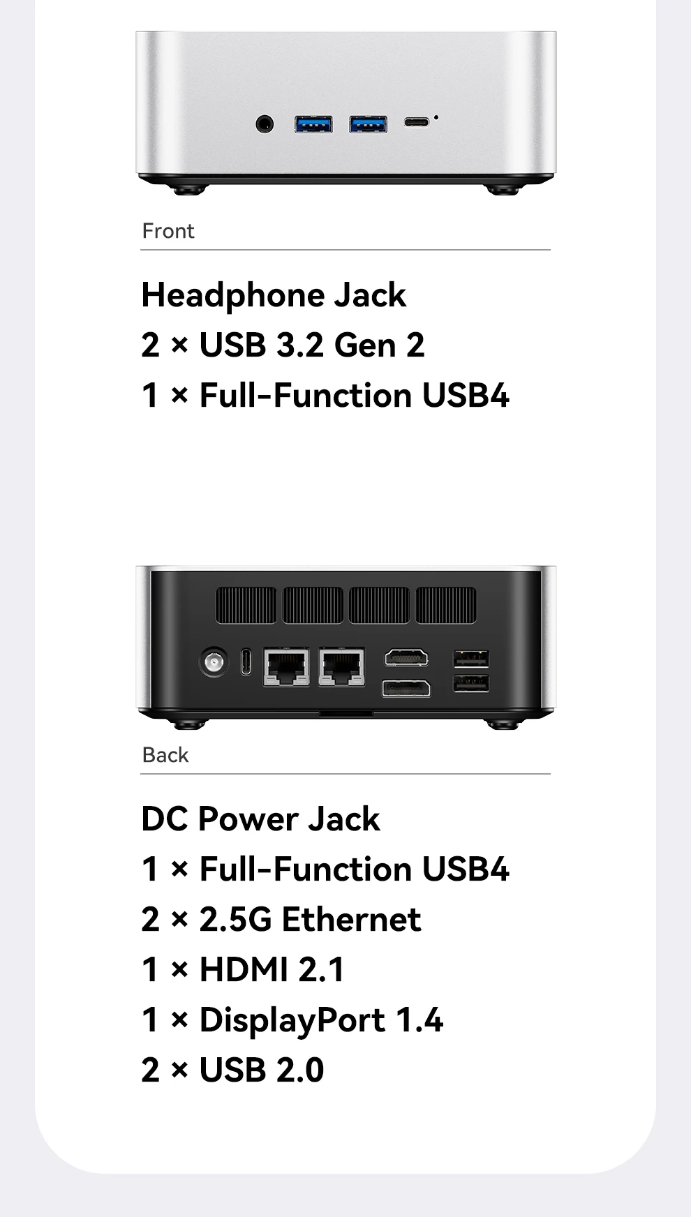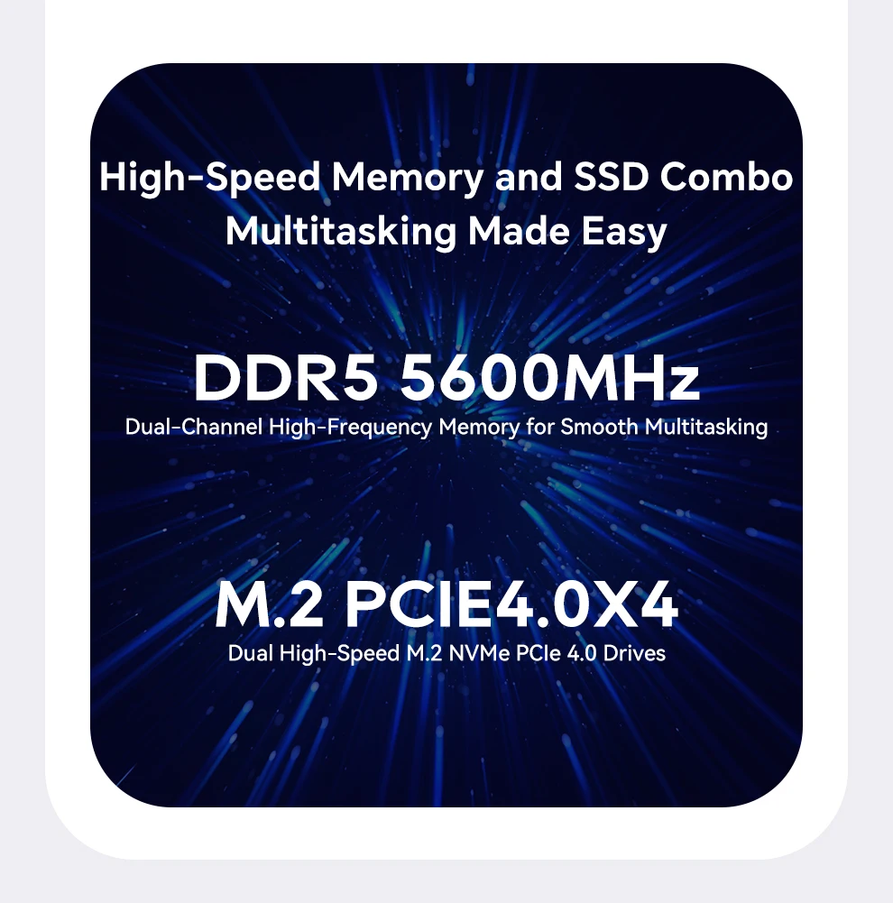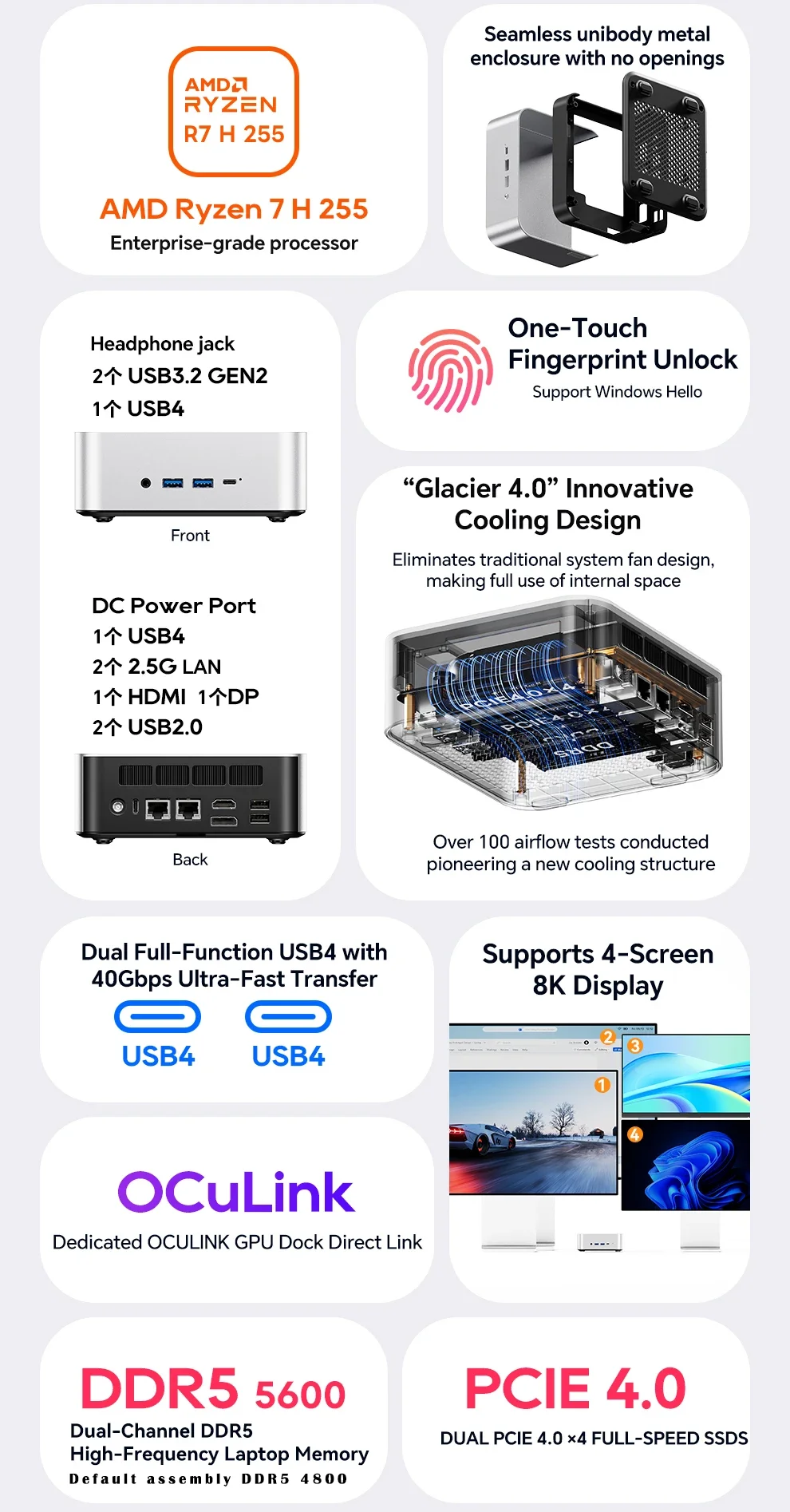 Almacenamiento: ranuras duales M.2 2280 NVMe PCIe 4.0×4Conexión en red: puertos RJ45 duales de 2,5 Gb (chip 226 Vx), Wi-Fi 6 + Bluetooth 5.2Puertos de E/S: 2 × USB4 (40 Gbps, función completa), 2 × USB 3.2 Gen2, 1 × USB 2.0, 1 × HDMI 2.1, 1 × DP 1.4, 2 × 2,5 GbE RJ45, 1 × OCuLink, 1 × audio jackSistema de refrigeración: "Sistema de refrigeración Glacier 4.0" (cámara de vapor VC de 5500 mm + ventilador turbo PWM de 67 aspas)Fuente de alimentación: fuente de alimentación de interfaz CC (adaptador de corriente incluido como regalo)Funciones de seguridad: desbloqueo de huellas dactilares con un clic, chip de seguridad de nivel empresarialSistema operativo: versión Barebone (sin sistema operativo preinstalado; compatible con Windows/Linux)