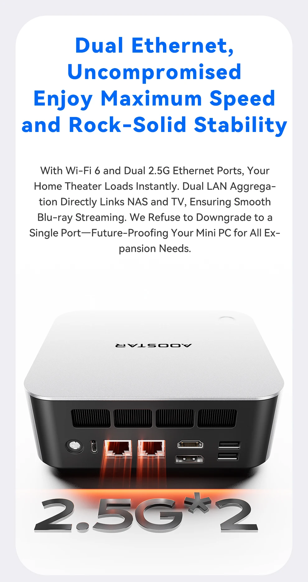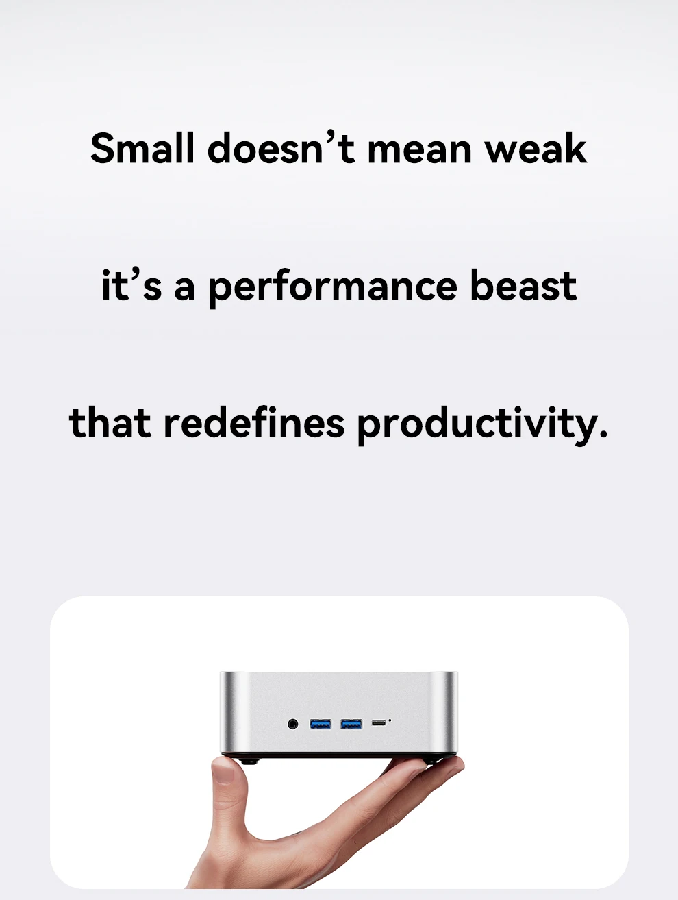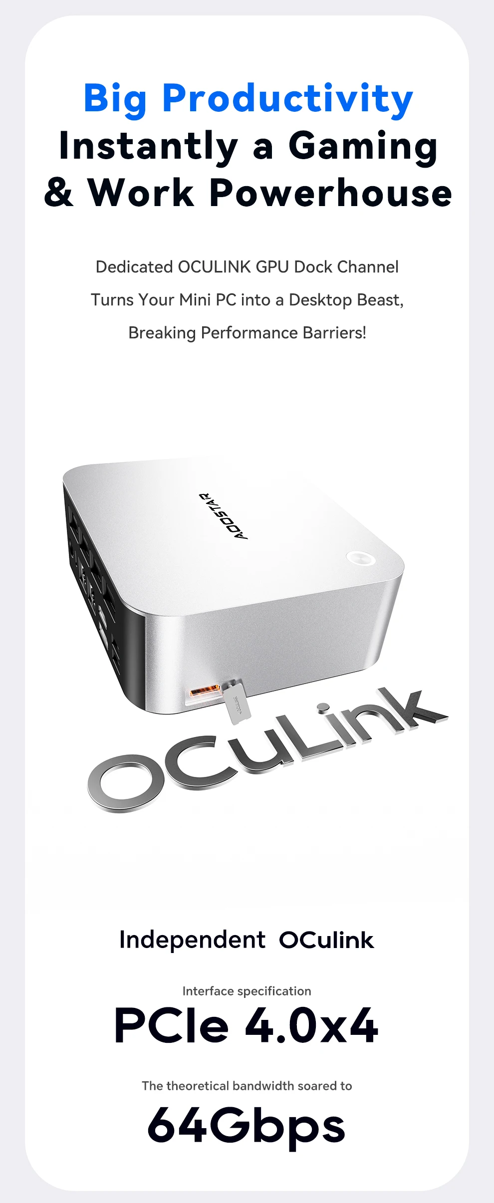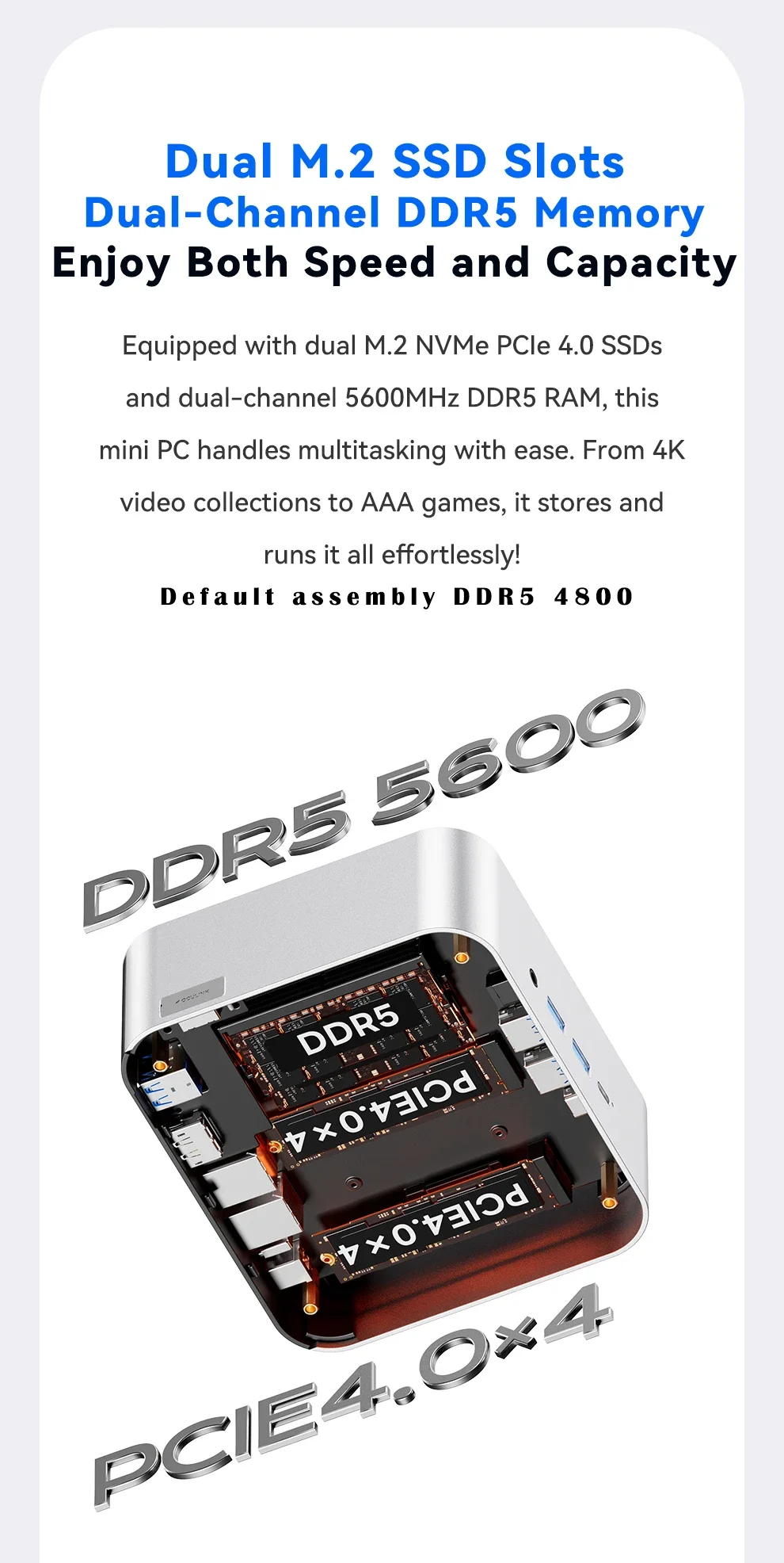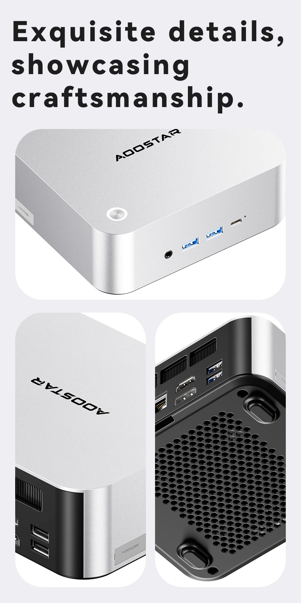 Almacenamiento: ranuras duales M.2 2280 NVMe PCIe 4.0×4Conexión en red: puertos RJ45 duales de 2,5 Gb (chip 226 Vx), Wi-Fi 6 + Bluetooth 5.2Puertos de E/S: 2 × USB4 (40 Gbps, función completa), 2 × USB 3.2 Gen2, 1 × USB 2.0, 1 × HDMI 2.1, 1 × DP 1.4, 2 × 2,5 GbE RJ45, 1 × OCuLink, 1 × audio jackSistema de refrigeración: "Sistema de refrigeración Glacier 4.0" (cámara de vapor VC de 5500 mm + ventilador turbo PWM de 67 aspas)Fuente de alimentación: fuente de alimentación de interfaz CC (adaptador de corriente incluido como regalo)Funciones de seguridad: desbloqueo de huellas dactilares con un clic, chip de seguridad de nivel empresarialSistema operativo: versión Barebone (sin sistema operativo preinstalado; compatible con Windows/Linux)