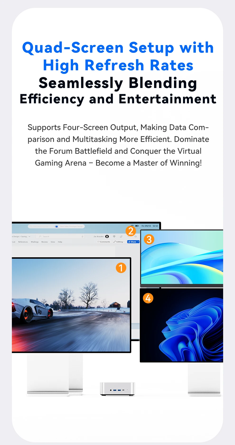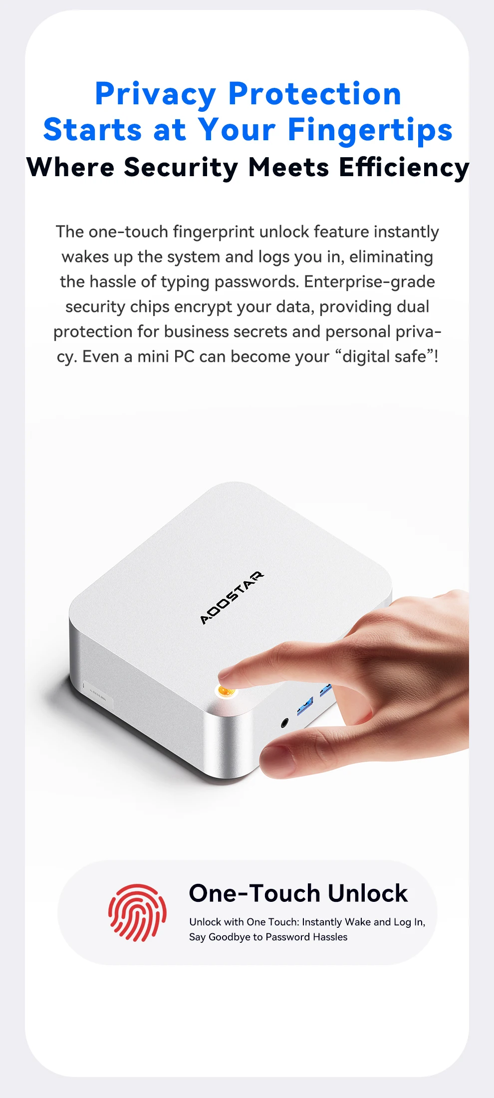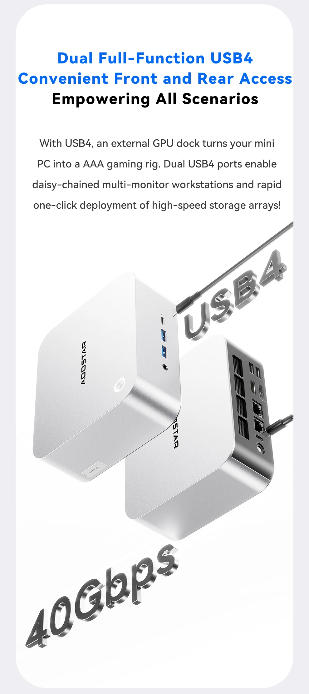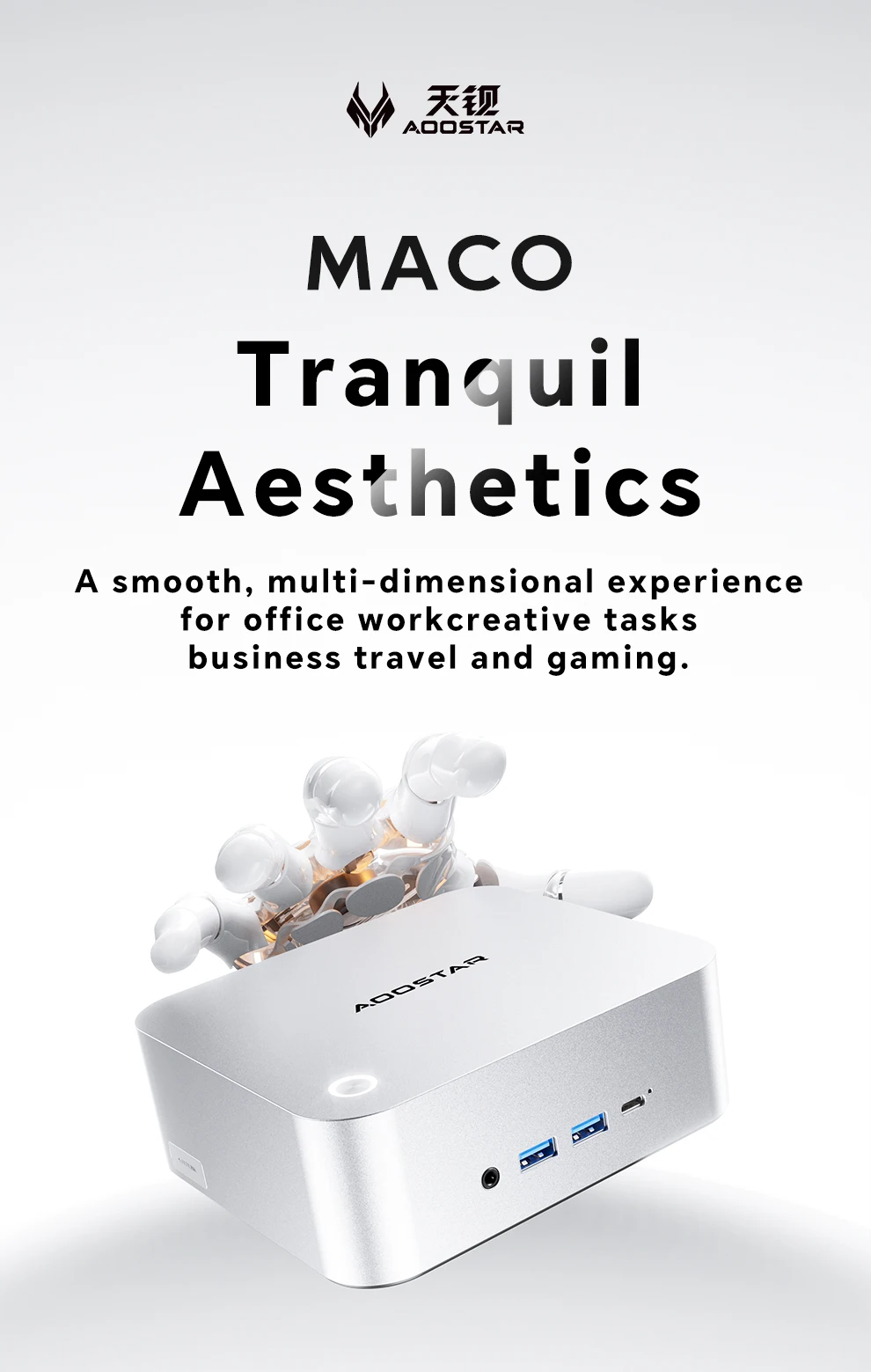 Almacenamiento: ranuras duales M.2 2280 NVMe PCIe 4.0×4Conexión en red: puertos RJ45 duales de 2,5 Gb (chip 226 Vx), Wi-Fi 6 + Bluetooth 5.2Puertos de E/S: 2 × USB4 (40 Gbps, función completa), 2 × USB 3.2 Gen2, 1 × USB 2.0, 1 × HDMI 2.1, 1 × DP 1.4, 2 × 2,5 GbE RJ45, 1 × OCuLink, 1 × audio jackSistema de refrigeración: "Sistema de refrigeración Glacier 4.0" (cámara de vapor VC de 5500 mm + ventilador turbo PWM de 67 aspas)Fuente de alimentación: fuente de alimentación de interfaz CC (adaptador de corriente incluido como regalo)Funciones de seguridad: desbloqueo de huellas dactilares con un clic, chip de seguridad de nivel empresarialSistema operativo: versión Barebone (sin sistema operativo preinstalado; compatible con Windows/Linux)