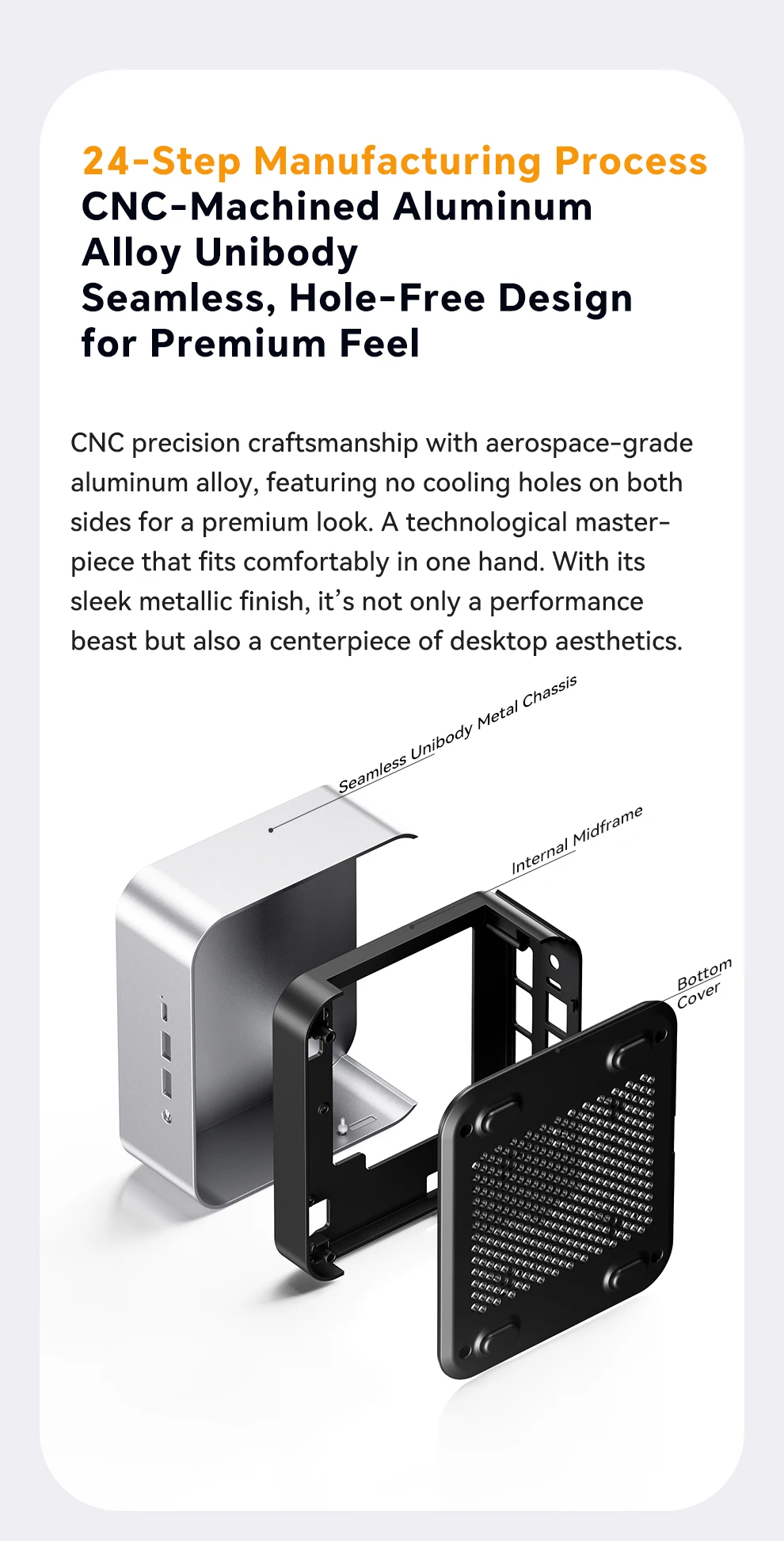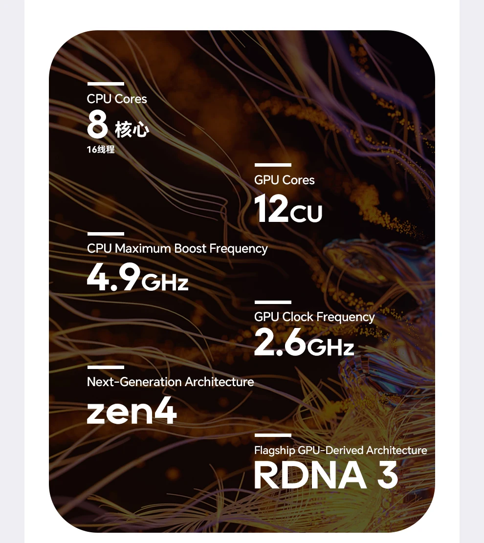 Procesador: AMD Ryzen 7 H255 (8 núcleos/16 hilos, frecuencia base de 3,8 GHz, impulso máximo de 4,9 GHz, caché L3 de 16 MB, arquitectura Zen 4)Gráficos: AMD Radeon 780M integrado (12 CU, 2,7 GHz, arquitectura RDNA 3)Placa base: mini placa base AMD de desarrollo propio (120 × 120 mm)Memoria: Ranuras DDR5 SO-DIMM duales (admite computadora portátil DDR5-4800MHz, doble canal) Montaje predeterminado DDR5 4800