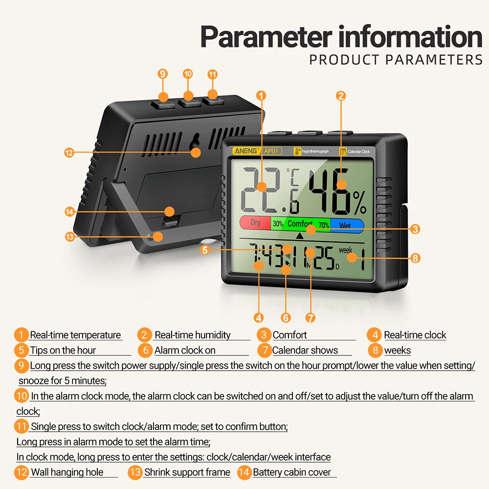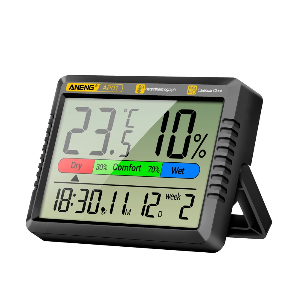Comprar AP01 Termómetro y higrómetro digital LCD Termómetro y higrómetro multiescena de mano Reloj electrónico