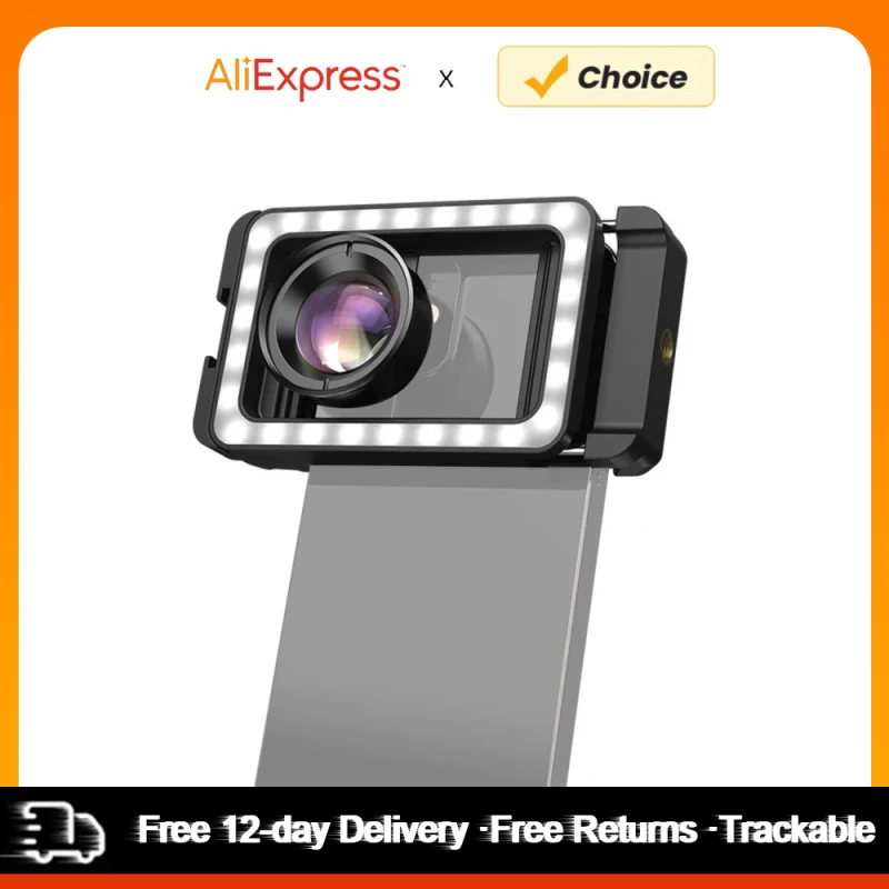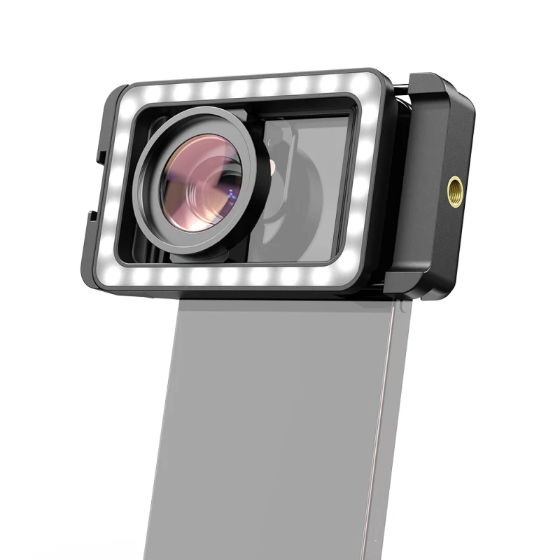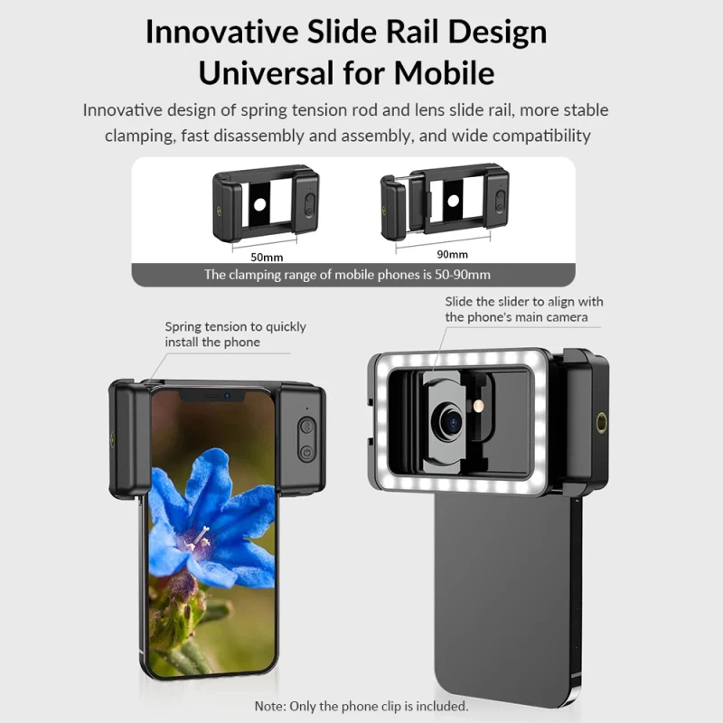 【Diseño todo-en-uno 】Este accesorio de lente de teléfono móvil combina abrazadera de teléfono, adaptador de lente y función de luz de relleno, proporcionando una solución integral para capturar fotos y videos impresionantes en entornos con poca luz.