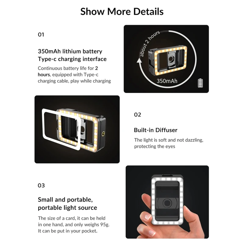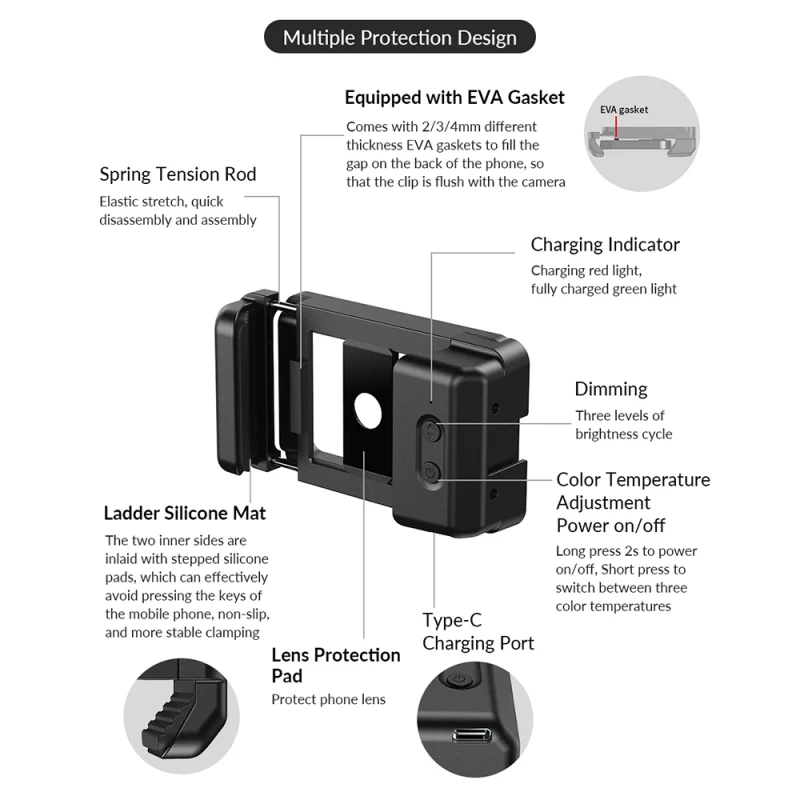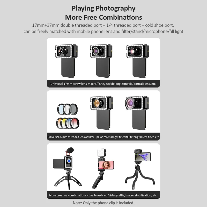 【Compatibilidad versátil】 Equipada con una interfaz de doble rosca de 17mm + 37mm, Esta abrazadera de teléfono con luz de relleno le permite emparejarla sin esfuerzo con varias lentes y filtros de teléfono inteligente.