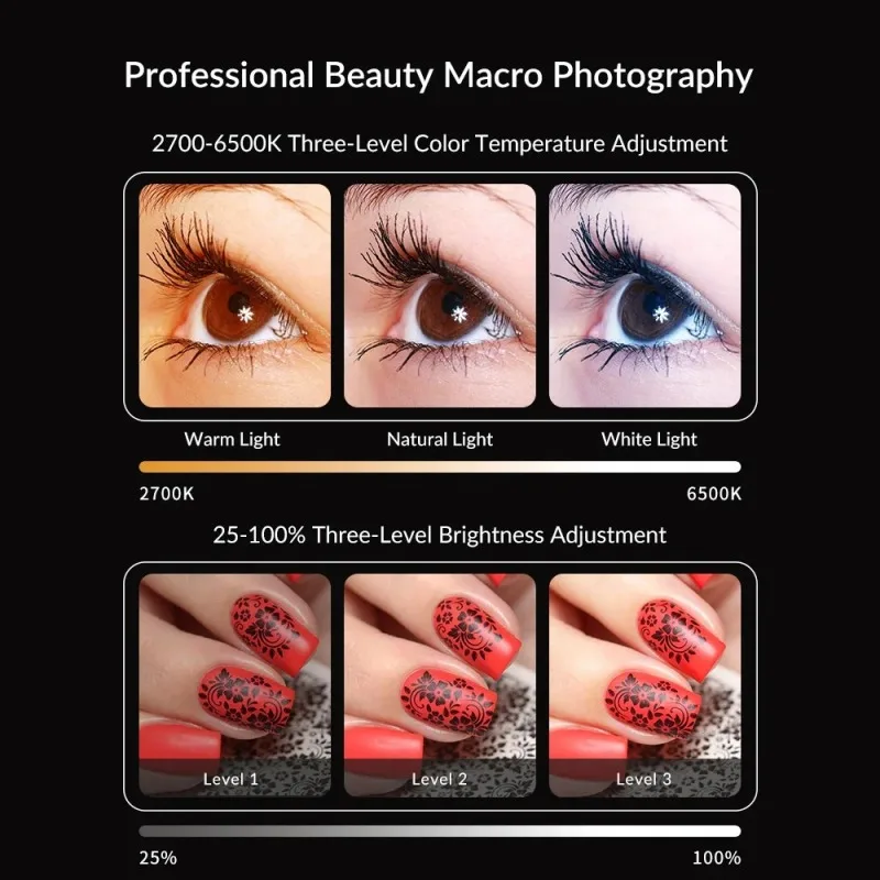 【Temperatura de color ajustable】Elija entre tres configuraciones de temperatura de color (2700K-6500K) para lograr el ambiente de iluminación perfecto para sus fotos y videos. Ya sea cálido y acogedor o fresco y vibrante, Este adaptador de lente lo tiene cubierto.