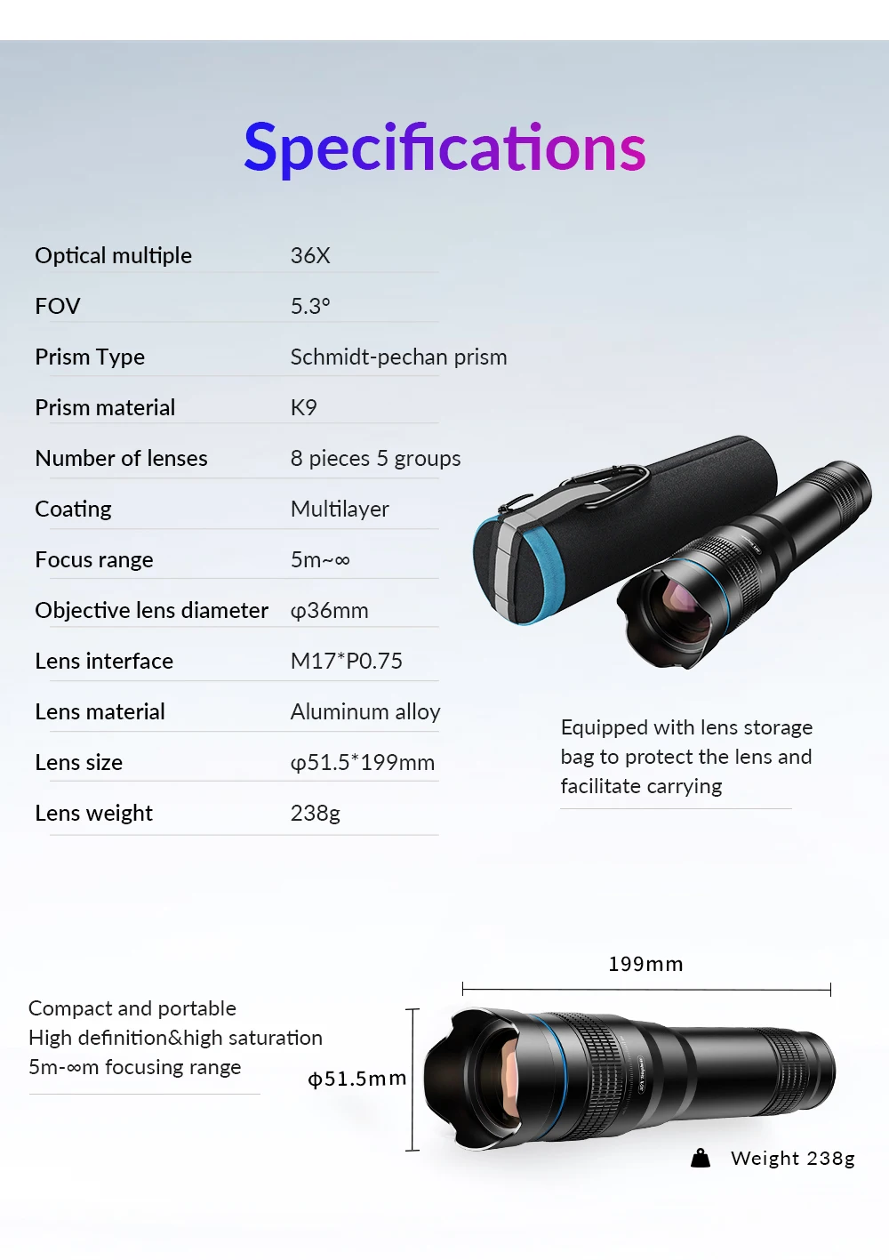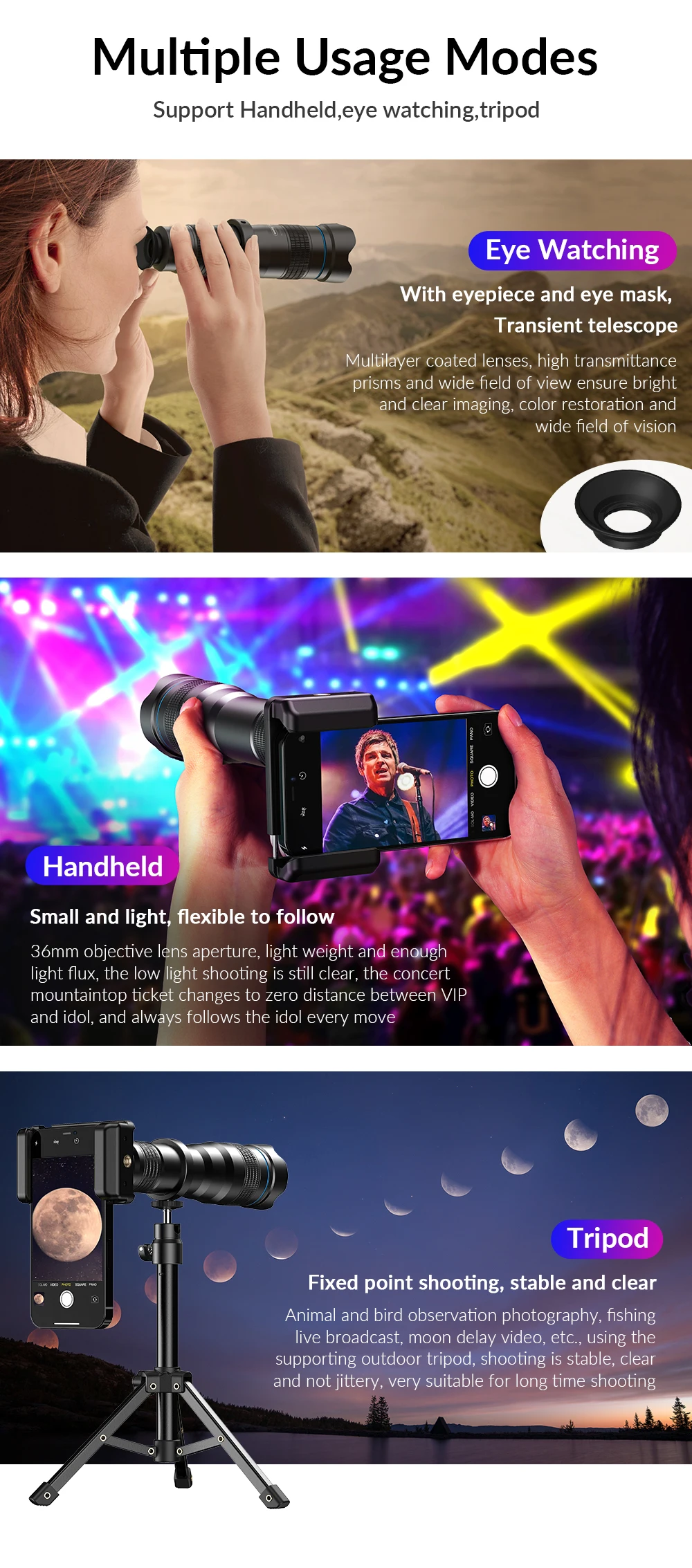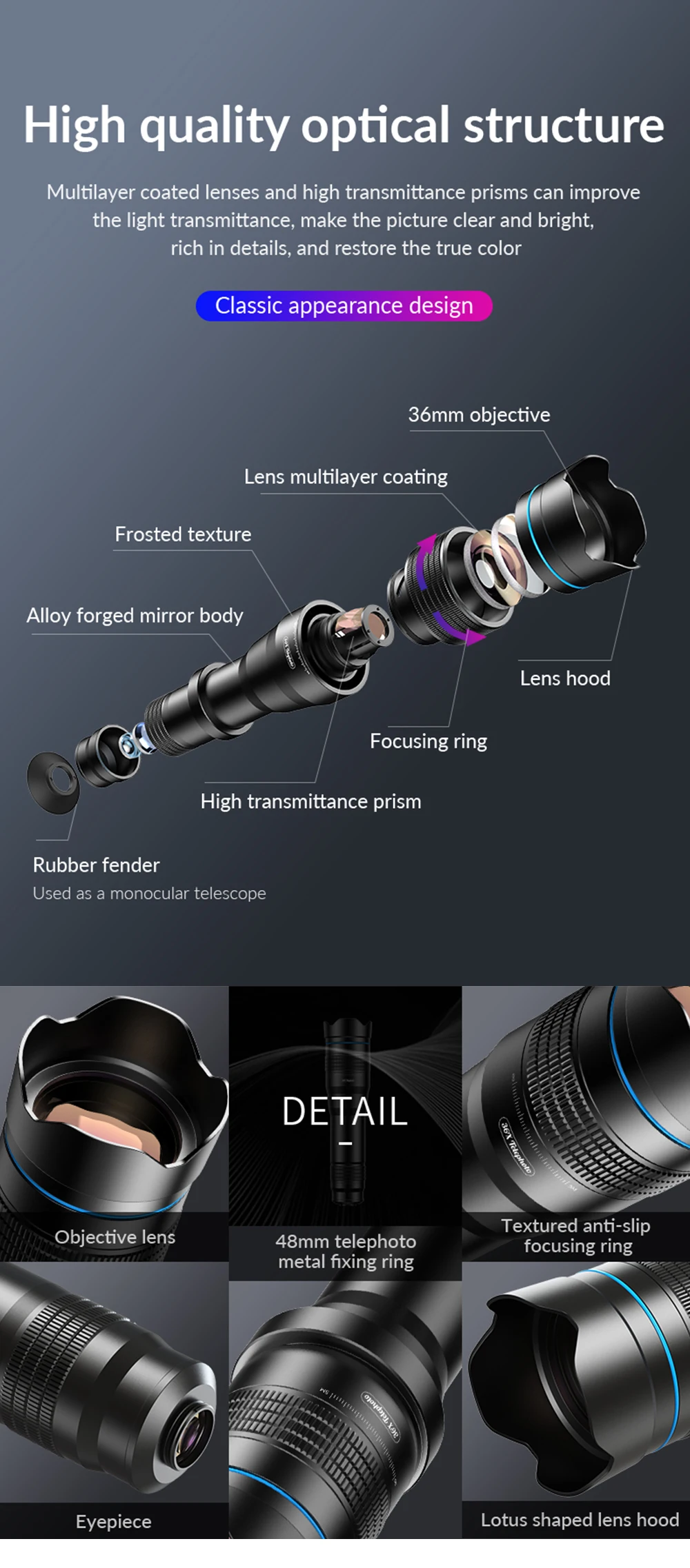 Este es un nuevo diseño de alta calidad óptica 36x telescopio zoom lente + mini trípode + obturador remoto, cumple con sus diferentes necesidades de fotografía.