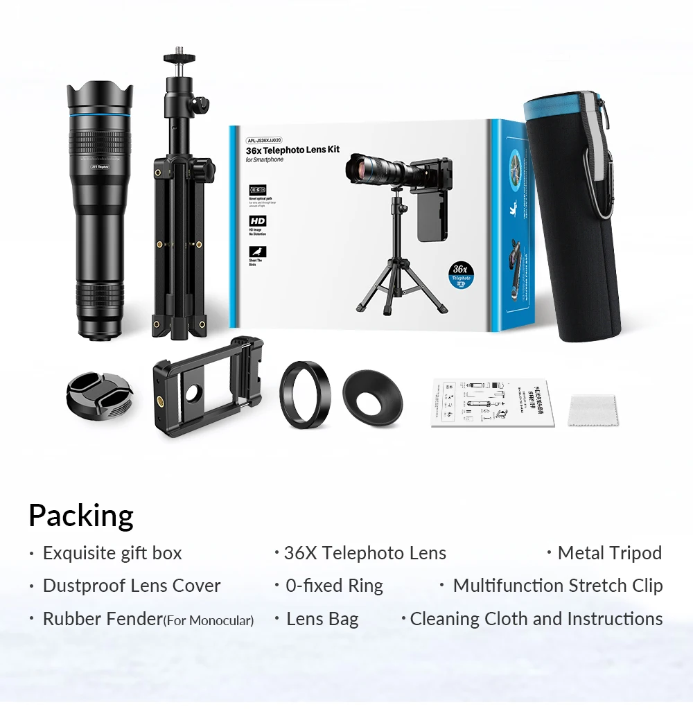 Comprar APEXEL-lente de Zoom teleobjetivo 36X con trípode de Metal, telescopio de Clip Universal para iPhone, Samsung, tiro de pájaros, observación de conciertos