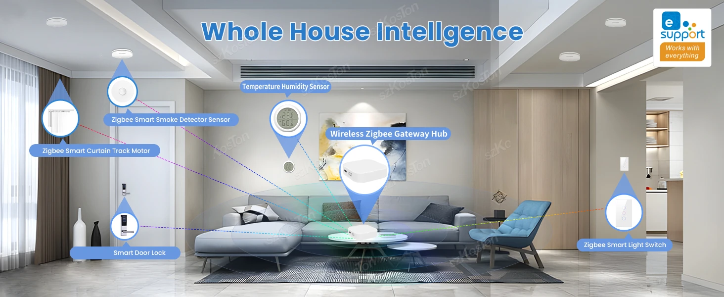 3. Red inalámbrica estable y confiable: la señal ZigBee cubre una amplia gama de áreas que son lo suficientemente estables y confiables para el trabajo normal de cualquier dispositivo conectado al concentrador.Szkoston