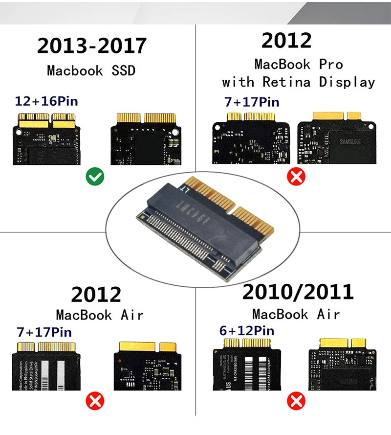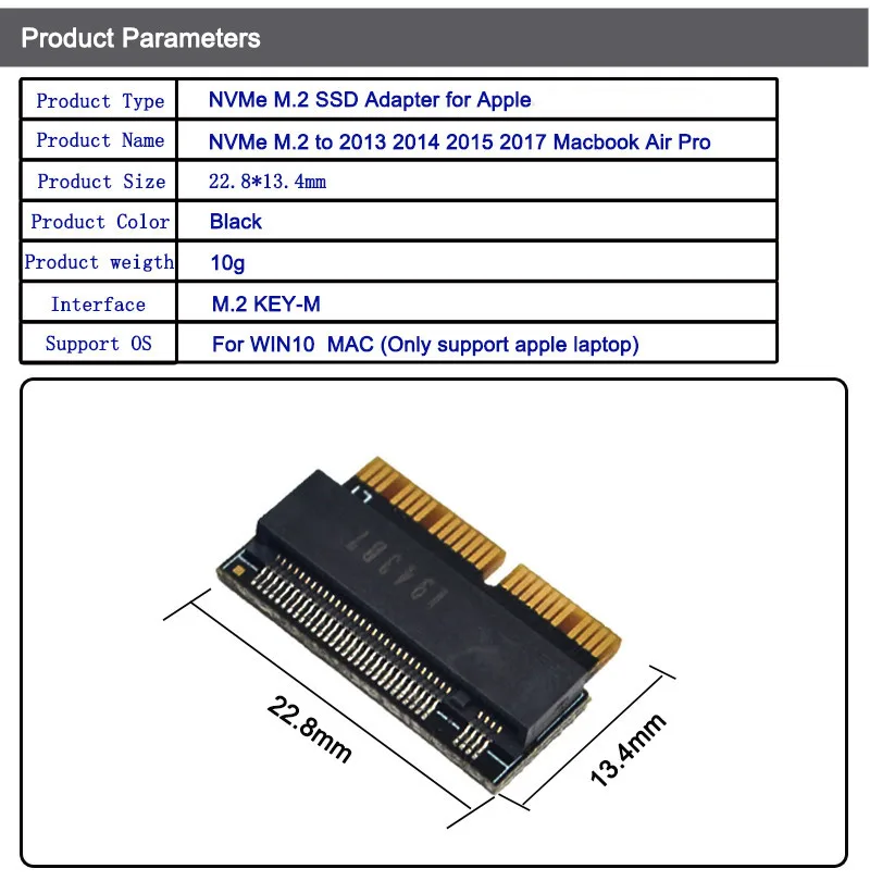 1: ¡Solo la tarjeta adaptadora de ventas, las imágenes de SSD y la placa base no son ventas!2: Es posible que el modo de suspensión de ahorro de energía no se pueda utilizar.ingrese "Preferencias del sistema"/ "Ahorro de energía", luego cierre "Adaptador de corriente"/ "Coloque los discos duros para dormir cuando sea posible" y "Batería"/ "Coloque los discos duros para dormir cuando sea posible".Luego mueva la flecha "Apague la pantalla después de" a la posición "Nunca".3: Abra la función de recorte después de instalar Mac OS; no es necesario abrirla manualmente si instala el sistema operativo Windows.4: Prepare el controlador de disco USB antes de usar el adaptador.Acerca del estándar de interfaz MacBook Air SSD:1: Versión 2010 y 2011 MacBook Air SSD es de 6+12 pines, solo un lado tiene contacto, el tamaño es de 109 mm * 24 mm. Es una interfaz SATA.2: La versión 2012 MacBook Air SSD es de 7 + 17 pines, el tamaño es de 109 mm * 24 mm. La versión 2012 MacBook Pro SSD es de 7 + 17 pines, el tamaño es de 89 mm * 33 mm. Es una interfaz SATA.3: Versión 2013 y 2014 y 2015 MacBook Air SSD es de ambos lados con contacto, un lado es de 16 + 12 pines, el otro lado es de 11 + 14 pines, el tamaño es de 89 mm * 24 mm. Es una interfaz PCIe X4.Versión 4: 2013 y 2014 y 2015 MacBook Pro SSD es de ambos lados con contacto, un lado es de 16 + 12 pines, el otro lado es de 11 + 14 pines, el tamaño es de 89 mm * 33 mm. Es una interfaz PCIe X4.
