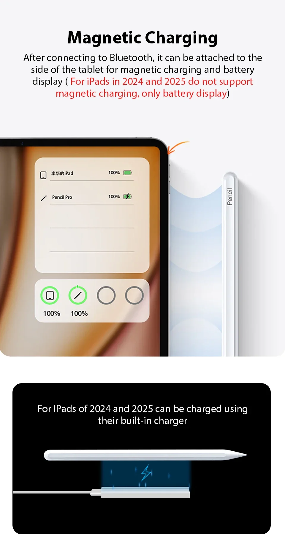 Los iPads de 2024 y 2025 no admiten carga magnética y solo admiten visualización de la batería.El lápiz táctil de 2018 a 2023 admite carga magnética y visualización de la batería.