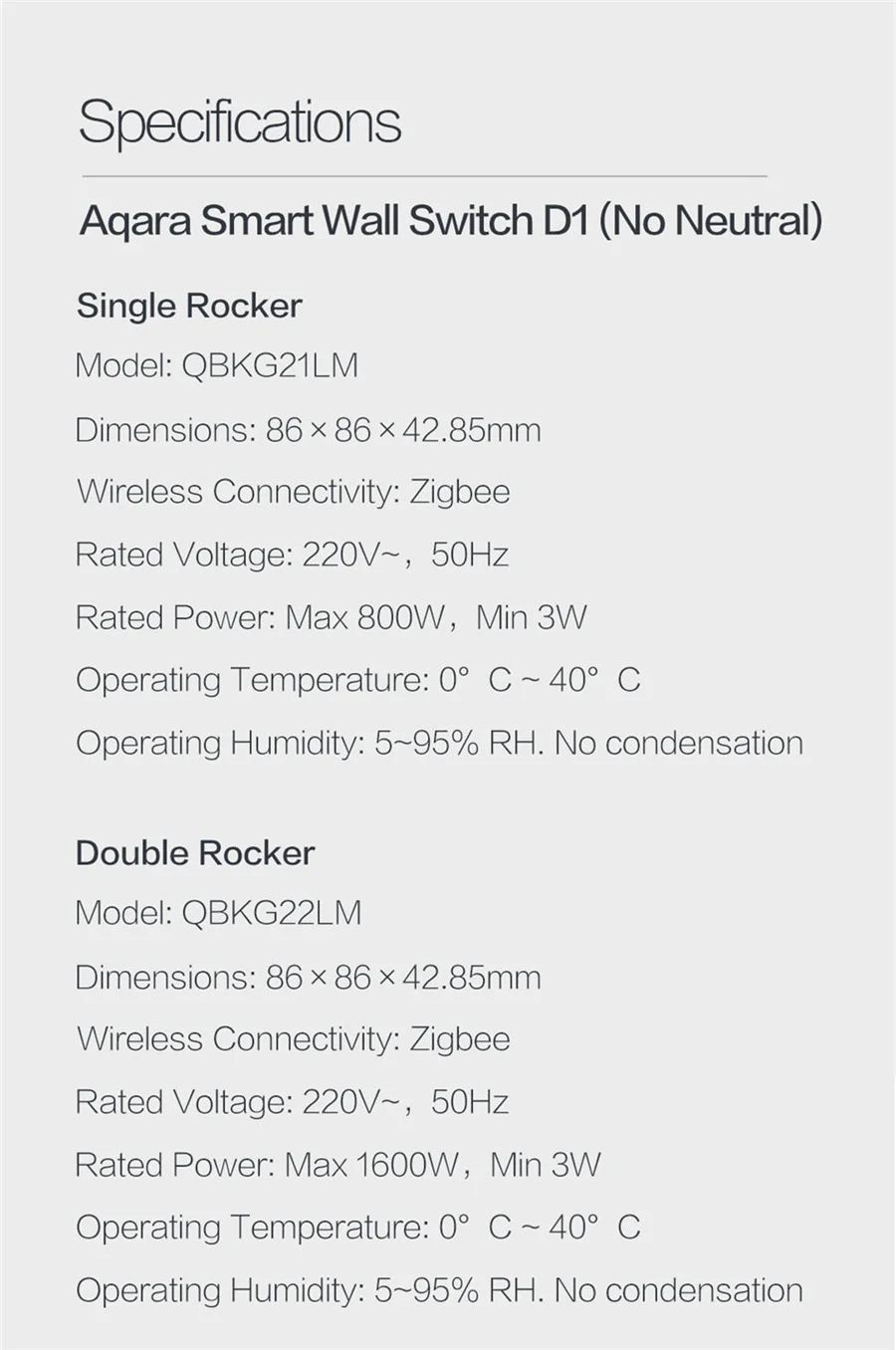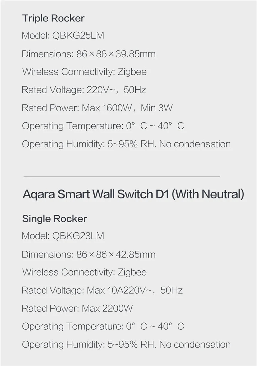 Nota: El interruptor puede cerrar el cable, cualquier lámpara puede pasar a través del cable; Si bien la tecla inalámbrica no está cableada, ZigBee solo puede controlar la lámpara o la luz inteligente mijia.2) Aqara Smart Switch D1 (sin neutro)Rocker únicoModelo: QBKG21LMDimensiones: 86x86x42,85mmConectividad inalámbrica: ZigbeeTensión nominal: 220V, 50HzCapacidad: Máx. 800 W, Min. 3 WTemperatura de funcionamiento: 0,C.40.C.Humedad del aire: 5 ~95% RH.Sin condensaciónDoble balancínModelo: QBKG22LMDimensiones: 86x86x42,85mmConectividad inalámbrica: ZigbeeTensión nominal: 220V ~,50HzCapacidad: Máx. 1600 W, Min. 3 WTemperatura de funcionamiento: 0,C.40.C.Humedad del aire: 5 ~95% RH.Sin condensaciónTriple balancínModelo: QBKG25LMDimensiones: 86x86x39,85mmConectividad inalámbrica: ZigbeeTensión nominal: 220V ~, 50HzCapacidad: Máx. 1600 W, Min. 3 WTemperatura de funcionamiento: 0 "C ~ 40 CHumedad del aire: 5 ~95% RH.Sin condensación3) Aqara Smart Switch D1 (neutro)Rocker únicoModelo: QBKG23LMDimensiones: 86 x 86 x 42,85 mmConectividad inalámbrica: ZigbeeTensión nominal: máx. 10A220V ~, 50HzCapacidad: Máx. 2200WTemperatura de funcionamiento: 0 "C ~ 40" CHumedad del aire: 5 ~95% RH.Sin condensaciónDoble balancínModelo: QBKG24LMDimensiones: 86x86x42,85mmConectividad inalámbrica: ZigbeeTensión nominal: máx. 10A220V ~, 50HzCapacidad: Máx. 2200WTemperatura de funcionamiento: 0 "C ~ 40 CHumedad del aire: 5 ~95% RH.Sin condensaciónTriple balancínModelo: QBKG26LMDimensiones: 86x86x39,85mmConectividad inalámbrica: ZigbeeTensión nominal: máx. 10A220V ~, 50HzCapacidad: Máx. 2200WTemperatura de funcionamiento: 0 "c ~ 40 CHumedad del aire: 5 ~95% RH. Sin condensación
