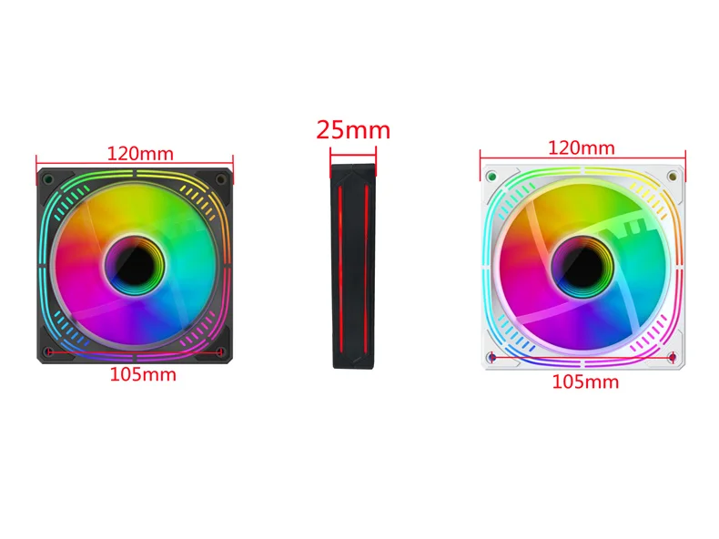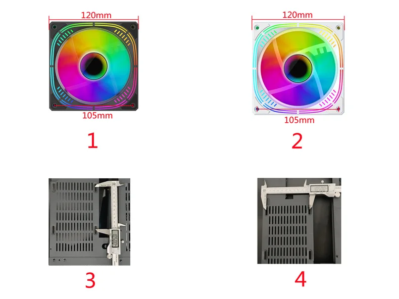 2 representa un ventilador (blanco) con un tamaño de 120mm y un espacio entre orificios centrales de 105mm
