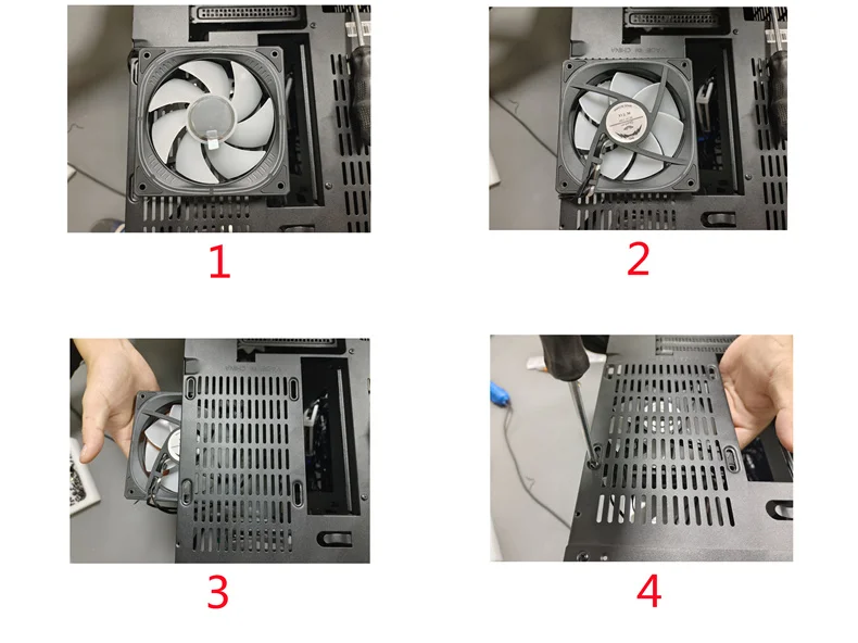 4 representa alinear el espaciado del orificio central del ventilador con el espaciado del orificio del panel del chasis, y luego apretar los tornillos entregados con una herramienta de destornillador para completar la instalación del ventilador