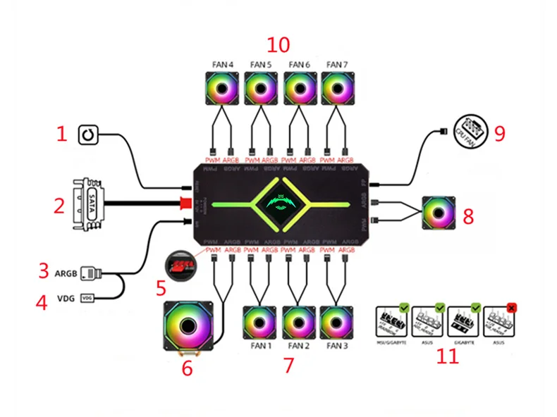 7 representa el ventilador ARGB controlado por temperatura 1-ventilador 3