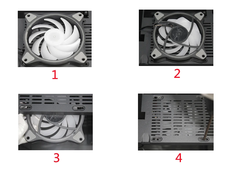 4 representa alinear el espaciado del orificio central del ventilador con el espaciado del orificio del panel del chasis, y luego apretar los tornillos entregados con una herramienta de destornillador para completar la instalación del ventilador